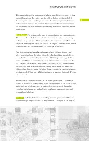 This doesn’t discount the importance of collaboration, high performance design methodology, getting the engineers at the table at the first meeting and all of these things. There is something at stake here about visioning the city. In terms of the historical moment, it is true that the landscape architects are in control of the vision of the city now, which is very interesting, and I think has mostly positive implications. David Fletcher To pick up on the issue of communication and representation… That person who leads that team—whether it’s architect, engineer, or landscape architect—they need to be able to persuade the hardcore native plant Nazis, and engineers, and everybody else of the value of the project. I don’t know that there’s necessarily Charles’ kind of ascendency of landscape architecture. One of the things that hasn’t been discussed today is this issue of money and where it’s coming from. One of the things I’ve talked with Kazys about is this issue of the D-minus that the American Society of Civil Engineers has graded the entire United States in terms of roads, water, infrastructure, and levies. Over the next five years they’re saying that you need to spend about 2.2 trillion dollars on infrastructure. If we look at the stimulus package for infrastructure, of the 787 billion dollars, there are about 120 billion that are going to be spent on infrastructure in general. Of that, just 1.2 billion is going to be spent on what’s called “green infrastructure.” The issue of the role of the architect or the landscape architect… I don’t know that it’s so much about making things iconic, having this goal of this heroic bridge and other icons of infrastructure, or making them more aesthetic, but rather reconfiguring infrastructure and making it work better, making systematic and network based solutions. Tim Love At the level of consensus-building that a design team would have to do around major projects like the Los Angeles River… this is part of the story too.