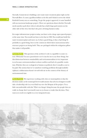 Fairfield County area or something. To get the project approved, it came bundled with an enormous landscape project. There are questions about whether Norwalk needs another park there when it already has a fairly large park system on the other side of the river, but that’s the price of doing business today. For major infrastructure projects today, you have to do a large open spaced project at the same time. You would not have to do that in 1963. You would just build the waste treatment plant and move on. Is that a good thing, is that a bad thing? It probably is a good thing, but it is the context in which these most noxious infrastructure projects are being built. They are packaged within the mitigation pillow that makes it all possible. Daniel Barber This question of the architect’s role is a squabble to some extent. Obviously I’m not a practitioner so it’s easy for me to say these things, but this distinction between sustainability and environmentalism is very important to us because environmentalism is about conflicts and lack of a possible resolution. Whether they are ecological or human or political, there’s usually a cost to be paid. The notion that we’re somehow resolving problems through multidisciplinary collaboration doesn’t sit well with me in the context of the history of environmental time. Martin Felsen My experience working with cities or municipalities is that the decision maker at the municipal level would assume that all of us designers would take a leadership role in a very fluid way over the lifespan of the project. I’m a little uncomfortable with this “Who’s in charge? thing because the people that are really in charge don’t necessarily want us to choose or make that decision. They want us to work very tightly in a very integrated team.