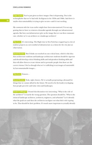 maybe what sustainability is trying to give us now—and it’s not working. My comment with the icon earlier might have been misconstrued. I’m not suggesting that we have to reinvent a formalist agenda through our infrastructural agenda. But how can infrastructure give us the image that we can then communicate, whether we’re an architect or a landscape architect? Tim Love It’s interesting. The High Line in New York has cropped up in a lot of student projects as a new symbol of infrastructure as a vision for the city. Just an observation. David Fletcher But I think you touched on one critical issue, which is this idea that architecture students and landscape architecture students should be rigorous and should develop critical thinking skills and independent thinking skills and that will allow them to create visions and to persuade people that those are the correct visions. I feel as though what we’re trafficking is not images of sustainability but unsustainable images… Tim Love Futures… David Fletcher Yeah, right, futures. We’re actually perpetuating a demand for things that we cannot afford in the future. We need to be the leaders in shaping how people perceive and value cities and landscapes. Sarah Goldhagen I found this discussion very interesting. “What is the role of the architect?” is exactly the wrong question. The question should be, “What is the vision of landscape architects, architects, engineers, and urbanists?” Let’s identify what the goals are and then the architects can figure out what their role is going to be. That should be their problem. It’s much more important to actually identify