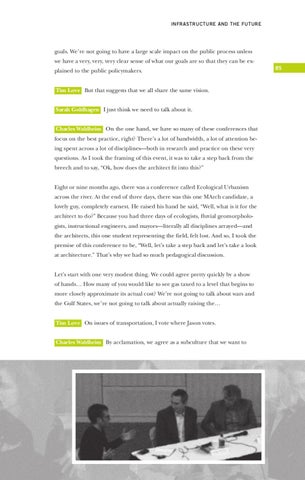 goals. We’re not going to have a large scale impact on the public process unless we have a very, very, very clear sense of what our goals are so that they can be explained to the public policymakers. Tim Love But that suggests that we all share the same vision. Sarah Goldhagen I just think we need to talk about it. Charles Waldheim On the one hand, we have so many of these conferences that focus on the best practice, right? There’s a lot of bandwidth, a lot of attention being spent across a lot of disciplines—both in research and practice on these very questions. As I took the framing of this event, it was to take a step back from the breech and to say, “Ok, how does the architect fit into this?” Eight or nine months ago, there was a conference called Ecological Urbanism across the river. At the end of three days, there was this one MArch candidate, a lovely guy, completely earnest. He raised his hand he said, “Well, what is it for the architect to do?” Because you had three days of ecologists, fluvial geomorphologists, instructional engineers, and mayors—literally all disciplines arrayed—and the architects, this one student representing the field, felt lost. And so, I took the premise of this conference to be, “Well, let’s take a step back and let’s take a look at architecture.” That’s why we had so much pedagogical discussion. Let’s start with one very modest thing. We could agree pretty quickly by a show of hands… How many of you would like to see gas taxed to a level that begins to more closely approximate its actual cost? We’re not going to talk about wars and the Gulf States, we’re not going to talk about actually raising the… Tim Love On issues of transportation, I vote where Jason votes. Charles Waldheim By acclamation, we agree as a subculture that we want to