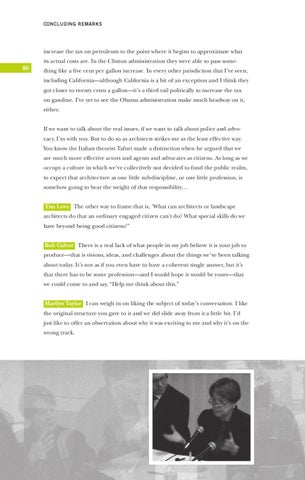 thing like a five cent per gallon increase. In every other jurisdiction that I’ve seen, including California—although California is a bit of an exception and I think they got closer to twenty cents a gallon—it’s a third rail politically to increase the tax on gasoline. I’ve yet to see the Obama administration make much headway on it, either. If we want to talk about the real issues, if we want to talk about policy and advocacy, I’m with you. But to do so as architects strikes me as the least effective way. You know the Italian theorist Tafuri made a distinction when he argued that we are much more effective actors and agents and advocates as citizens. As long as we occupy a culture in which we’ve collectively not decided to fund the public realm, to expect that architecture as one little sub-discipline, or one little profession, is somehow going to bear the weight of that responsibility… Tim Love The other way to frame that is, ‘What can architects or landscape architects do that an ordinary engaged citizen can’t do? What special skills do we have beyond being good citizens?” Bob Culver There is a real lack of what people in my job believe it is your job to produce—that is visions, ideas, and challenges about the things we’ve been talking about today. It’s not as if you even have to have a coherent single answer, but it’s that there has to be some profession—and I would hope it would be yours—that we could come to and say, “Help me think about this.” Marilyn Taylor I can weigh in on liking the subject of today’s conversation. I like the original structure you gave to it and we did slide away from it a little bit. I’d just like to offer an observation about why it was exciting to me and why it’s on the wrong track.