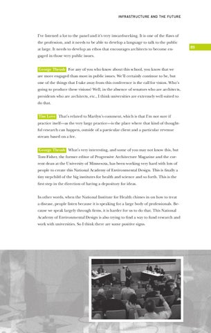 I’ve listened a lot to the panel and it’s very inward-seeking. It is one of the flaws of the profession, and it needs to be able to develop a language to talk to the public at large. It needs to develop an ethos that encourages architects to become engaged in those very public issues. George Thrush For any of you who know about this school, you know that we are more engaged than most in public issues. We’ll certainly continue to be, but one of the things that I take away from this conference is the call for vision. Who’s going to produce these visions? Well, in the absence of senators who are architects, presidents who are architects, etc., I think universities are extremely well suited to do that. Tim Love That’s related to Marilyn’s comment, which is that I’m not sure if practice itself—as the very large practice—is the place where that kind of thoughtful research can happen, outside of a particular client and a particular revenue stream based on a fee. George Thrush What’s very interesting, and some of you may not know this, but Tom Fisher, the former editor of Progressive Architecture Magazine and the current dean at the University of Minnesota, has been working very hard with lots of people to create this National Academy of Environmental Design. This is finally a tiny stepchild of the big institutes for health and science and so forth. This is the first step in the direction of having a depository for ideas. In other words, when the National Institute for Health chimes in on how to treat a disease, people listen because it is speaking for a large body of professionals. Because we speak largely through firms, it is harder for us to do that. This National Academy of Environmental Design is also trying to find a way to fund research and work with universities. So I think there are some positive signs.