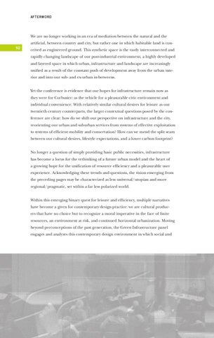 ceived as engineered ground. This synthetic space is the vastly interconnected and rapidly changing landscape of our post-industrial environment, a highly developed and layered space in which urban, infrastructure and landscape are increasingly unified as a result of the constant push of development away from the urban interior and into our sub- and ex-urban in-betweens. Yet the conference is evidence that our hopes for infrastructure remain now as they were for Corbusier: as the vehicle for a pleasurable civic environment and individual convenience. With relatively similar cultural desires for leisure as our twentieth century counterparts, the larger contextual questions posed by the conference are clear: how do we shift our perspective on infrastructure and the city, reorienting our urban and suburban services from systems of effective exploitation to systems of efficient mobility and conservation? How can we mend the split seam between our cultural desires, lifestyle expectations, and a lower carbon footprint? No longer a question of simply providing basic public necessities, infrastructure has become a locus for the rethinking of a future urban model and the heart of a growing hope for the unification of resource efficiency and a pleasurable user experience. Acknowledging these trends and questions, the vision emerging from the preceding pages may be characterized as less universal/utopian and more regional/pragmatic, set within a far less polarized world. Within this emerging binary quest for leisure and efficiency, multiple narratives have become a given for contemporary design practice: we are cultural producers that have no choice but to recognize a moral imperative in the face of finite resources, an environment at risk, and continued horizontal urbanization. Moving beyond preconceptions of the past generation, the Green Infrastructure panel engages and analyzes this contemporary design environment in which social and