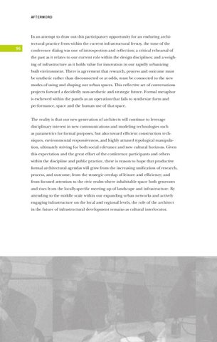 conference dialog was one of introspection and reflection; a critical rehearsal of the past as it relates to our current role within the design disciplines; and a weighing of infrastructure as it holds value for innovation in our rapidly urbanizing built environment. There is agreement that research, process and outcome must be synthetic rather than disconnected or at odds, must be connected to the new modes of using and shaping our urban spaces. This reflective set of conversations projects forward a decidedly non-aesthetic and strategic future. Formal metaphor is eschewed within the panels as an operation that fails to synthesize form and performance, space and the human use of that space. The reality is that our new generation of architects will continue to leverage disciplinary interest in new communications and modeling technologies such as parametrics for formal purposes, but also toward efficient construction techniques, environmental responsiveness, and highly attuned typological manipulation, ultimately striving for both social relevance and new cultural horizons. Given this expectation and the great effort of the conference participants and others within the discipline and public practice, there is reason to hope that productive formal architectural agendas will grow from the increasing unification of research, process, and outcome; from the strategic overlap of leisure and efficiency; and from focused attention to the civic realm where inhabitable space both generates and rises from the locally-specific meeting up of landscape and infrastructure. By attending to the middle scale within our expanding urban networks and actively engaging infrastructure on the local and regional levels, the role of the architect in the future of infrastructural development remains as cultural interlocutor.