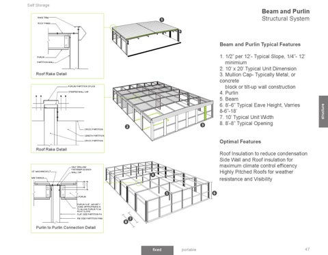 1. 1/2” per 12’- Typical Slope, 1/4”- 12’ minimium 2. 10’ x 20’ Typical Unit Dimension 3. Mullion Cap- Typically Metal, or concrete block or tilt-up wall construction 4. Purlin 5. Beam 6. 8’-6” Typical Eave Height, Varries 8-6”-18’ 7. 10’ Typical Unit Width 8. 8’-8” Typical Opening