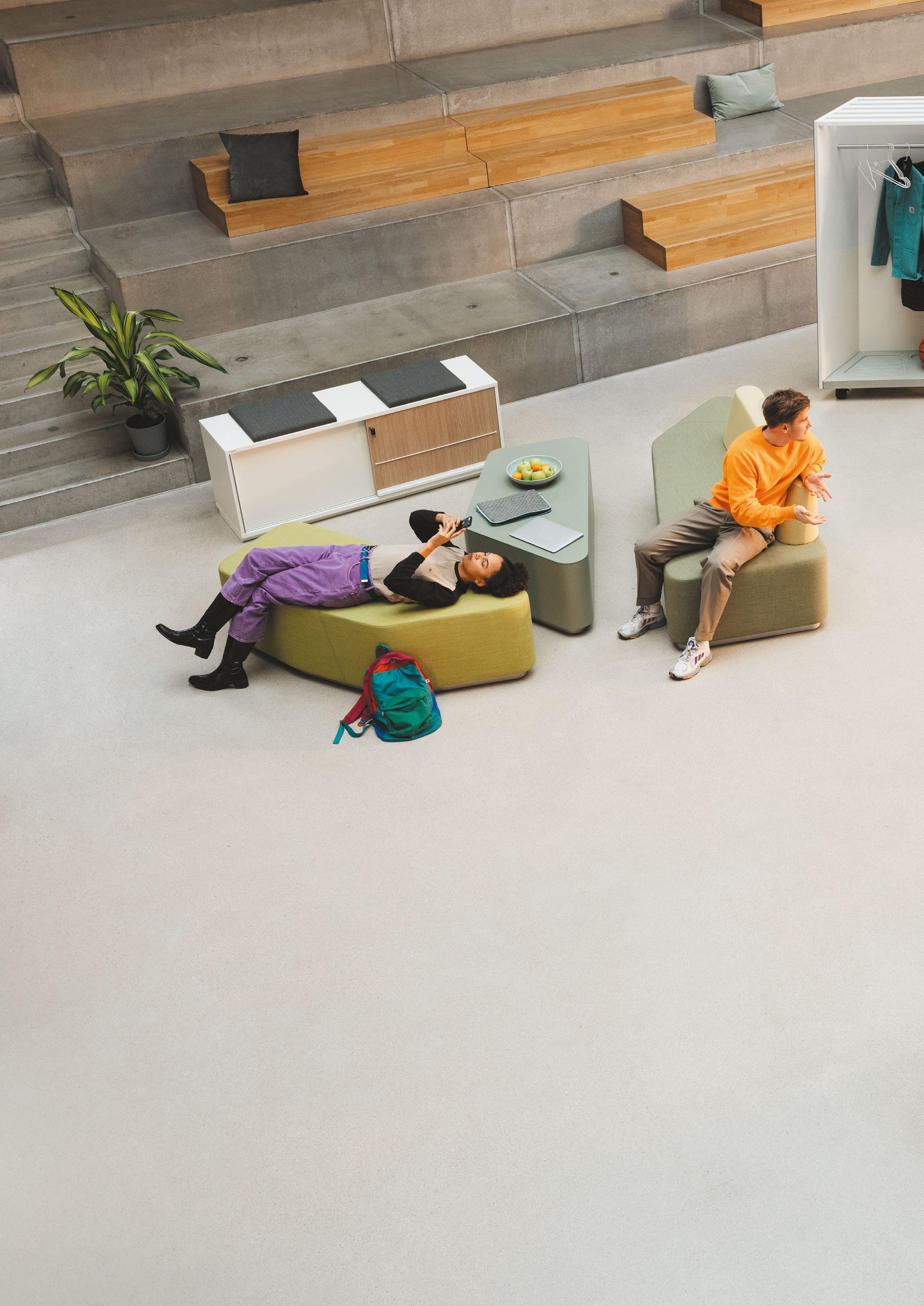 Verschieben nach Lust und Laune. In der Aula und im Gangbereich bilden Loungemöbel oder Sitzgruppen ein Zentrum für Kommunikation. Flexible Loungemöbel können nach Belieben von Schüler:innen und Student:innen verschoben werden, sodass unterschiedliche Settings gestaltet und individuelle Bedürfnisse erfüllt werden können.