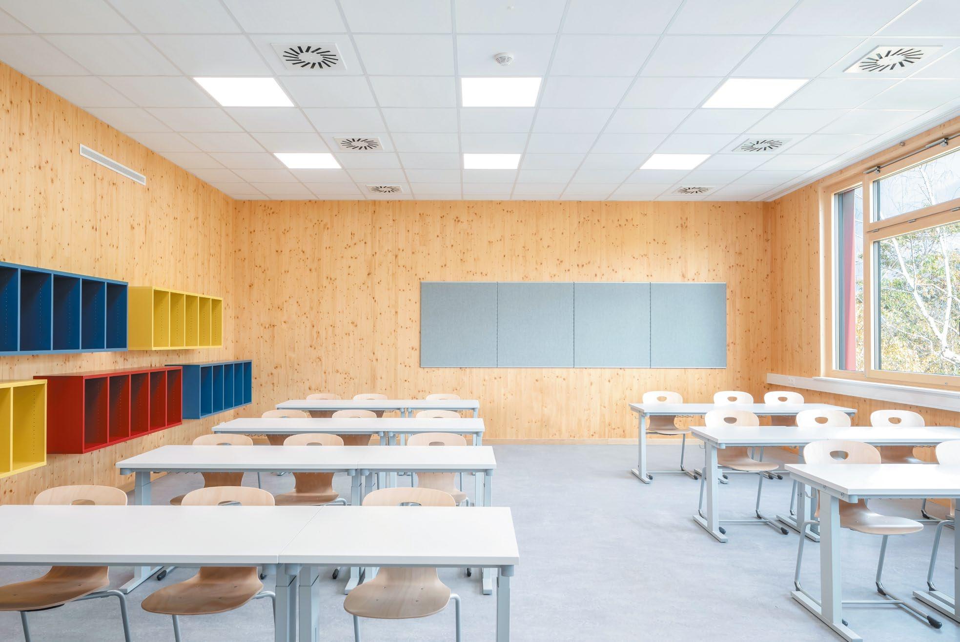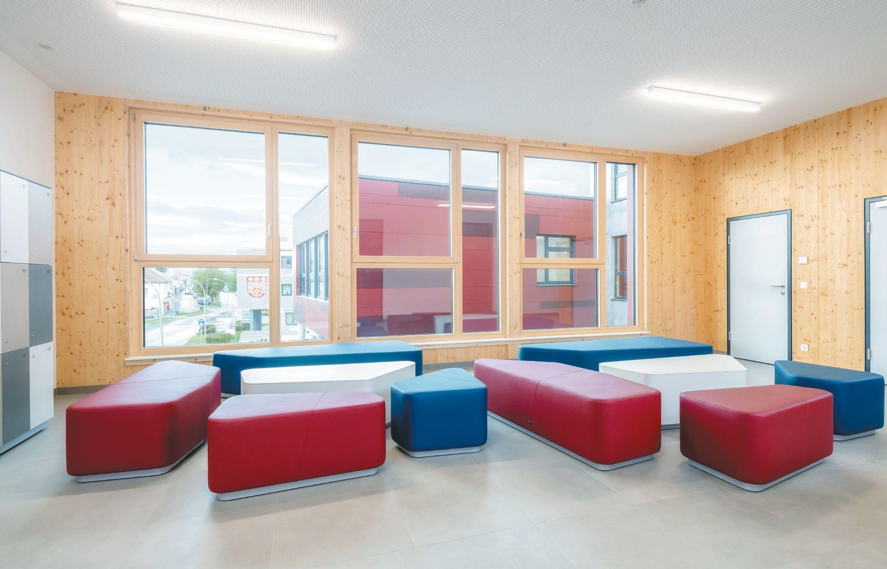 Höhenanpassbare Tische für Groß und Klein, bunte Regale als Farbakzent und Staufläche sowie akustisch wirksame Pinnwände bieten Raum für Entfaltung.