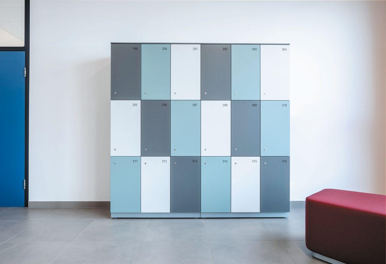 Platz für Persönliches. In Spinden und Lockern können Jacke, Schuhe und Wertsachen verstaut und die Jause in Sicherheit gebracht werden. Mit Fronten in Akzentfarben sorgen sie für einen individuellen Touch.