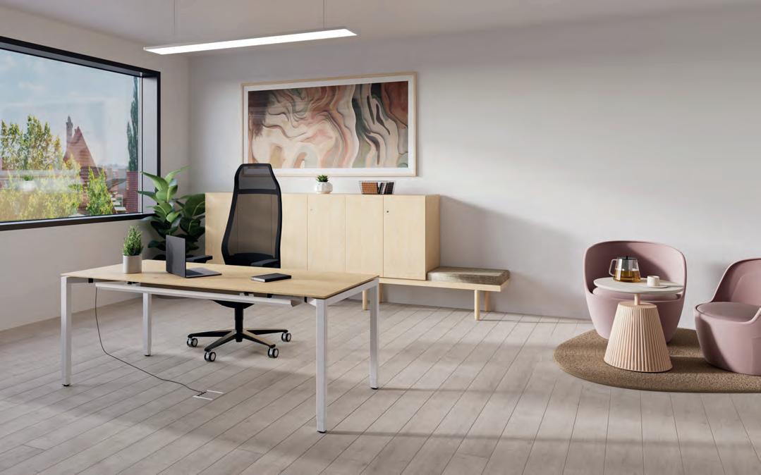 Zum Beispiel unsere stufenlos höhenverstellbaren Sitz-Steh-Arbeitstische, Twintables und Workbenches, die gesunde Bewegung ins Spiel bringen. Oder unsere Privacy Walls und Pinnwände, die in offenen Bürolayouts ein Mehr an Privatsphäre schaffen, während abgerundete Konturen, Wohlf ühlstoffe und Echtholzelemente für willkommene Wohnlichkeit sorgen.
