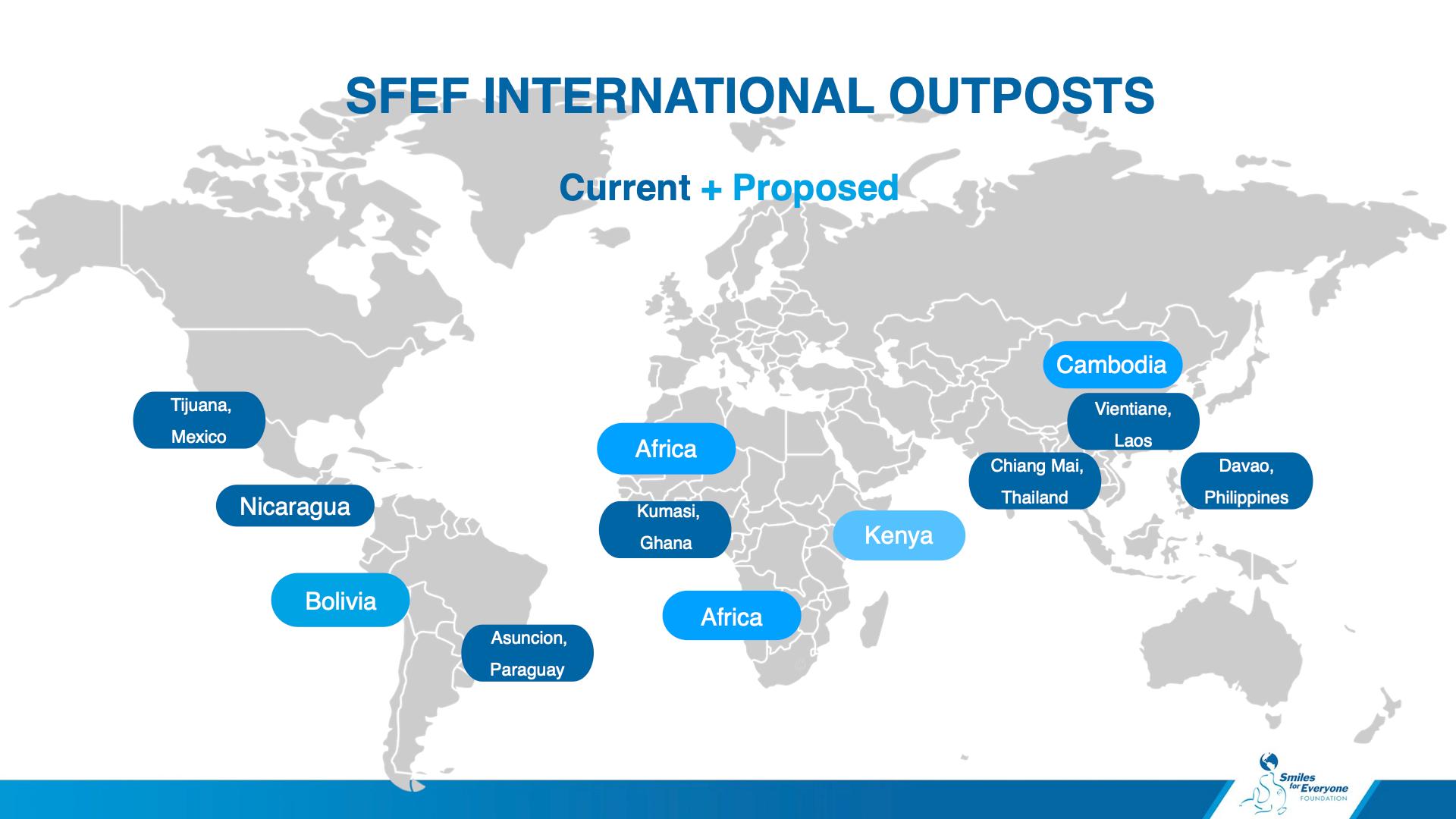 The foundation currently operates seven International Outposts in Kumasi, Ghana; Asuncion, Paraguay; Nicaragua; Tijuana, Mexico; Davao, Philippines; Chiang Mai, Thailand; and Vientiane, Laos to continue the philanthropic work that Smile Brands initiated, making Smiles for Everyone Foundation the largest not-for-profit provider of dental care around the world. 2