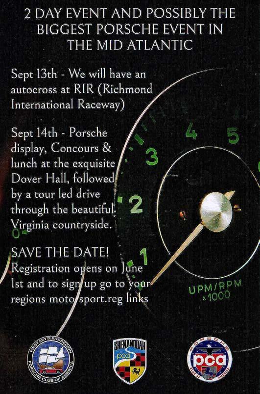 I’m also proud to report that we saw increased attendance at our events from neighboring PCA regions such as Shenandoah, Hurricane, Carolinas, Blue Ridge, Wilderness Trail, and Potomac Regions! As a matter of fact, for PCA’s 70th Anniversary Weekend in September, FSR and Shenandoah Regions will be co-hosting an Auto Cross event at Richmond International Raceway on 13 September, and the Richmond Porsche Meet (RPM) on 14 September. This year’s RPM will take place at Dover Hall in Manakin-Sabot, Virginia and will consist of a full concours, catered lunch, and end-of-day Fun Run so please keep your calendars open!
