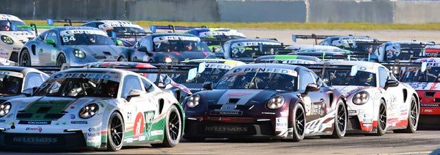 Sebring hosted the opening two 40-minute rounds of the Porsche Carrera Cup. Here in race 2, the cars ran so close that almost every driver error caused multicar collisions. No one gave an inche.