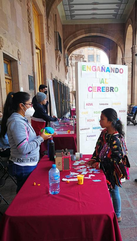 2: A young indigenous girl selling handcraft bags from San Luis Potosí listens to Rosario, who is explaining the different functions of the brain, during Brain Awareness week at the Plaza de Armas in downtown San Luis Potosí