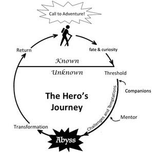 The “Hero’s Journey” is a story structure in which the hero begins in familiar territory before feeling a tug to adventure. They might initially resist, but fate and curiosity conspire to pull them to the threshold between what is known and what is unknown. Beyond it lie challenges and temptations, but the hero is not alone: they often have companions and mentors. Things are hard but exciting, and the future looks bright