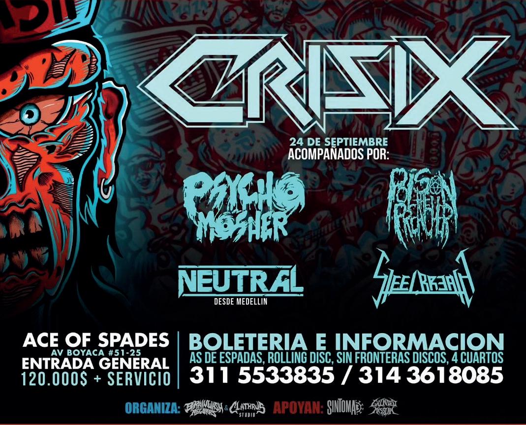 Integrantes del cartel de bienvenida a la banda “Crisix” de España en el famoso salón de conciertos de rock: Ace of Spades, junto a bandas de Crossover Thrash de la capital colombiana.