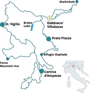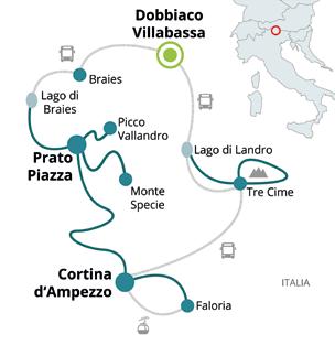 Tour začíná v údolí Alta Pusteria, na severní hranici Dolomit, poté pokračuje údolími řek Isarco a Adige, která vyznačují západní hranici tohoto pohoří; po projetí Bolzanem se dostanete do Trenta a následně údolím Valsugana do Feltre. Bývalá dolomitská železnice vás pak povede směrem k olympijskému městu Cortina d’Ampezzo. Než zakončíte tento vzrušující okruh návratem do Alta Pusterie, vychutnáte si výhledy na slavný „trojzubec“ Tre Cime di Lavaredo.
