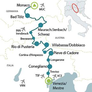 Cyklotrasa Mnichov – Benátky nabízí velmi pestrý itinerář, který protíná 5 regionů. Čeká vás zážitek, který spojuje potěšení z cestování na kole a dobrodružství přejezdu Alp od Německa přes Rakousko až po příjezd na Jadran v Itálii. Cyklotrasa začíná v bavorské metropoli Mnichov a končí v Benátkách. Vede nejdříve podél bavorských jezer a řeky Inn v tyrolském údolí Inntal, poté pokračuje přes nádherné Dolomity, dále do Trevisa a poté do lagunového města Benátky s kanály a historickými budovami. Jedinečné střídání velkých měst a malých romantických vesniček, jezer, údolí, hradů a pevností... tuto trasu si nelze nezamilovat!