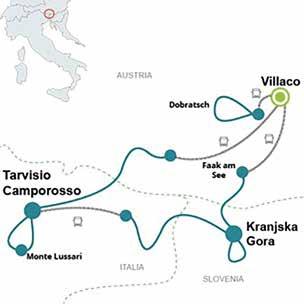 Výchozím bodem této prohlídky je korutanské město Villach, kde se stékají řeky Dráva a Gail. Z Rakouska však brzy přejedete do Itálie, do regionu Friuli-Venezia Giulia, který nabízí velmi rozmanitou krajinu, ale také značné kulturní bohatství, jež se odráží v místní kuchyni, silně ovlivněné tradicemi alpsko-rakouskými, ale i slovinskými a benátskými. Poté, co za sebou necháte vrcholy Karnských Alp, pojedete na kole pozvolně klesajícím profilem směrem k Jaderskému moři, abyste dosáhli jeho širokých pláží s bílým pískem. Budete tak mít za sebou poslední úsek velkolepé trasy Alpe Adria, která překračuje Alpy a spojuje kouzelné rakouské město Salcburk s italským turistickým centrem Grado a následně pokračuje podél pobřeží do Terstu.