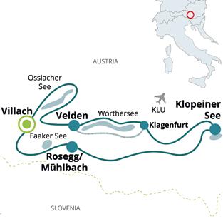 Okruh okolo korutanských jezer vás zavede k objevování nejkrásnějších přírodních vodních ploch této oblasti. Rozmanitá panoramata, doprovázená kopcovitým a místy lehce hornatým profilem, vás uchvátí svými tyrkysově zbarvenými jezery. Vliv Středomoří činí klima v tomto koutě jižního Rakouska obzvláště mírné, proto je zde velmi příjemné jezdit na kole od dubna do října. Trasa vás zavede z Villachu k jezerům Faaker See a Klopeiner See, a dále přes město Klagenfurt k jezeru Wörthersee, než se vrátíte do oblasti Villachu, kde objevíte jezero Ossiacher See. Tento krátký okruh nabízí nenáročný itinerář mezi korutanskými jezery, bez pasáží s příliš náročnými úseky, je proto vhodný i pro rodiny s dětmi.