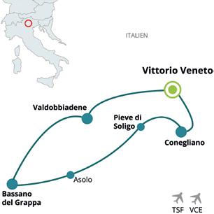 Prosecco se pěstuje z odrůdy bílých hroznů Glera ve velké oblasti zahrnující regiony Veneto a Friuli Venezia Giulia. Od roku 2009 je chráněno označením DOC (denominazione di origine controllata neboli chráněné označení původu). Jízda na kole v této oblasti plné vinic je zážitkem, který rozhodně stojí za to! Čeká na vás oblast plná kouzelných míst se zajímavou historií, tradicemi i uměním, ale i nečekaná překvapení, která svědčí o její tisícileté minulosti: starobylé hrady, šlechtické vily, památky, rodinná vinařství a sklepy, kde místní obyvatelé udržují při životě tradici a potěšení z pohostinnosti. Bude proto povinností ochutnat jejich typické místní produkty. Označením Prosecco se může pyšnit víno vyrobené z hroznů pouze v této konkrétní oblasti.