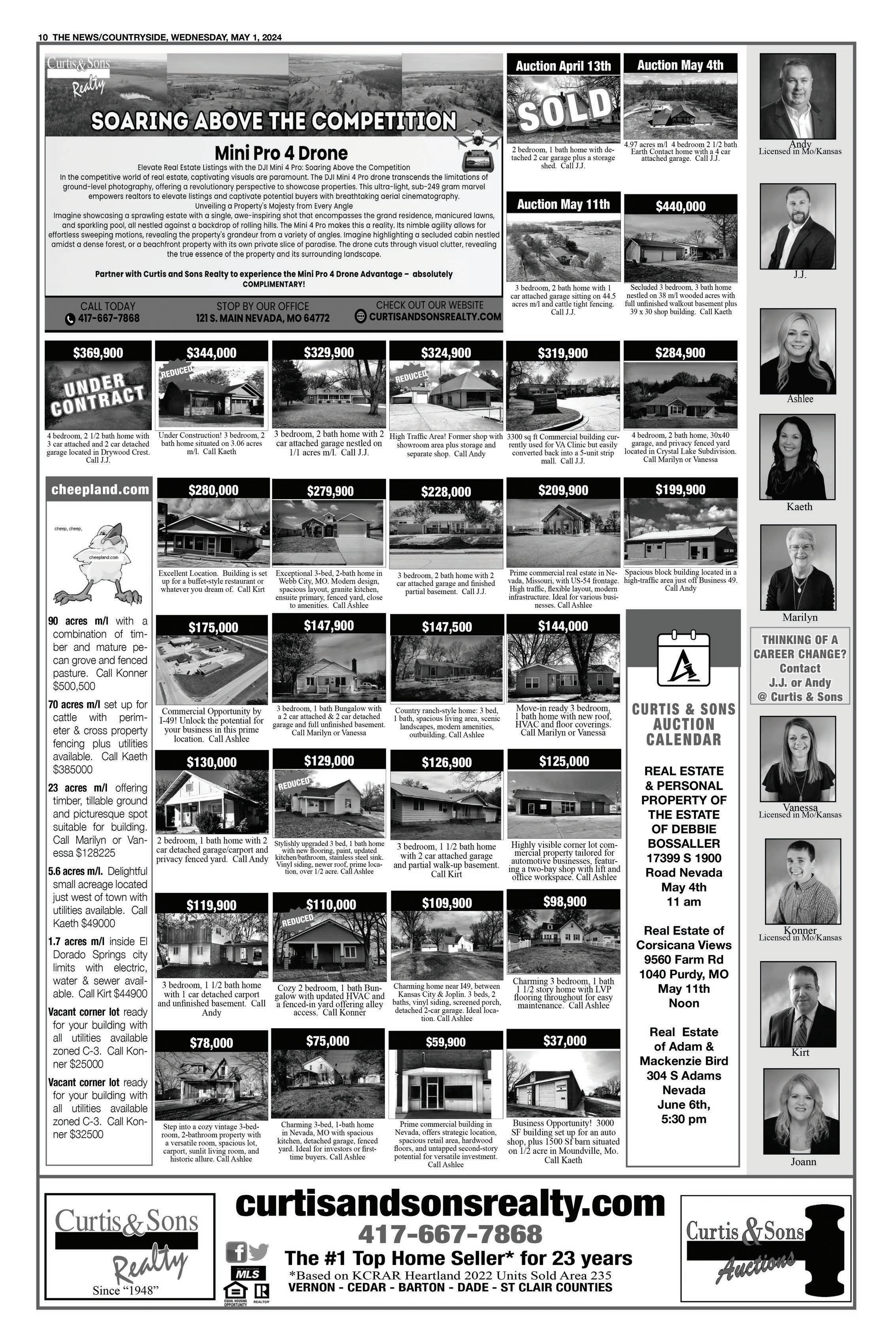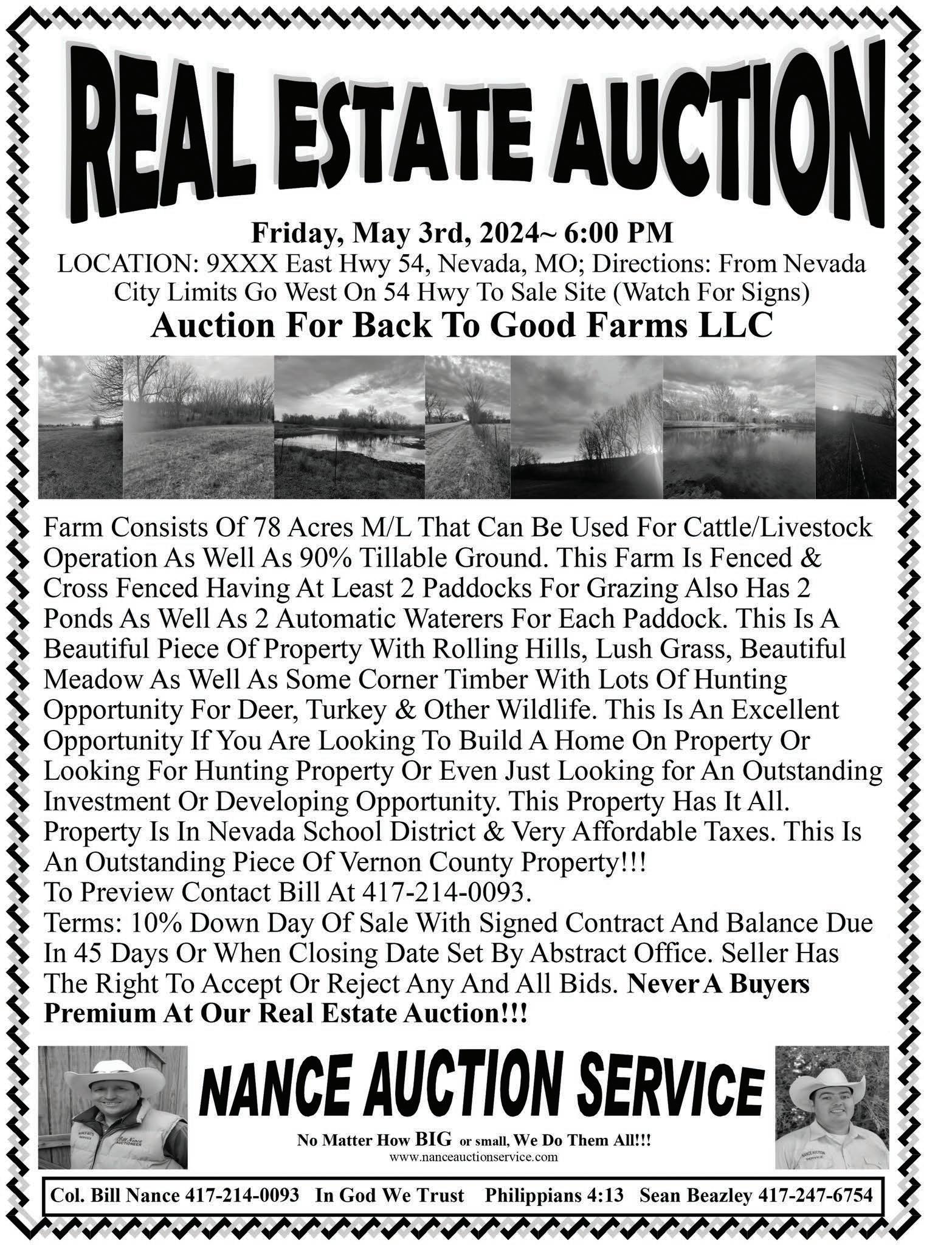PRSRT STD U.S. Postage Paid Permit No. 40 Nevada, Mo. 64772 131 S. Cedar Nevada, MO 417-667-3344 6 N. Main Fort Scott, KS 620-223-2110 VOL. 91 WEDNESDAY, MAY 1, 2024 NO. 07 The area’s only delivered paper to 34,000 readers each and every week. Total market coverage for both Vernon County, Missouri and Bourbon County, Kansas Your Leader in Precision Ag Since 1999 Hi! This is Crystal of Deanna E. Francis Tax Service 128 W. Walnut Nevada, MO 417667-5139 Let me help with your tax, accounting and payroll needs. Home businesses, small/medium businesses, farms.....all sizes welcome. Call for an estimate TOWN & COUNTRY Real Estate & Auction Service DOUG WORTMAN - 417-448-9540 doug@tncnevada.com Broker/Auctioneer Licensed in Missouri & Kansas Farms • Estate •Antiques www.tncnevada.com See our Real Estate ad on page 11 Town & CountryReal Estate & Auction Service Ranches • Farmland • Hunting Land Troy Scotten 417-448-7163 troy@tncnevada.com Taylor Scotten 417-684-1224 ctscotten@gmail.com 1700 W Austin Blvd., Nevada, MO 64772 417-667-2966 • www.tncnevada.com Licensed in Missouri & Kansas Sunday, April 10th, 2016~1:00 PM LOCATION: 26280 South 1425 Road, Sheldon, MO; Directions: From Sheldon Go West On N Hwy To 1425 Road Then North To Sale Site Or From Nevada Go South On BB Hwy To 1425 Road Then Continue South To Sale Site (Watch For Signs) Auction For Barb & The Late Ivan Diggins Auctioneers Note: As Ms. Diggins Has Sold Her Farm We Will Offer A Very Clean & Outstanding Farm & Estate Auction. Equipment & Tools Are Very Clean & Ready. There Are Some Very Neat Households, Beer Items & Antiques. This Is A Very Nice Auction. Something Here For Everyone. Please Plan Now To Attend. Sale Order: Furniture, Households & Antiques, Will Sell First Followed By Small Tools & Outdoor Items. At Approx 3:00 PM Will Offer Tractors, Auto, & Large Items. Remainder Of Small Tools & Outdoor Will Finish Auction. See Ya There!!! Terms: Cash or check with proper ID. Now accepting most major credit cards. Nothing removed until settled for. Statements mad e the day of sale takes precedence over printed material. Everything sold as is where is. Not responsible for accidents. Restroom available. Conces sions Provided By Pig Out Grill. Check our website for upcoming auctions and for additional pictures!! Magnum 325 4 Wheeler, JD 190 Walking Plow, Fuel Barrel On Stand, Tractor Wheel Chains, 16 Ft Gate, Calf Hut, Steel Posts, 2 Rolls Barbed Wire, Fence Stretchers, Buckets, Sm Field Sprayer, RxR Ties, Used Tires, Other Items Not Listed Car, Tillers, Yard Cart, Tools & Outdoor Related Items 1994 Grand Prix LE 4 Door Car That Has 4 Cy Motor, Auto Trans, Approx 100,000 Miles, JD 15 Yard Utility Dump Cart, Snapper RT8 Rear Tine Shredder On Wheels W/Tongue, Weed Eater, Leaf Blower, Yard Seeder, Garden Seeder, Chainsaw Parts, Stihl 028 Chainsaw, Craftsman Chainsaw, Shindawa Chainsaw, Wheelbarrow, Sm 115 Arc Welder, Sm Torch Set W/Bottles, Dewalt Upright Compressor, Table Saw, Scroll Saw, Chop Saw, Drill Press, Sm Electrical Tools, Kerosene BTU Heater, Battery Charger, Air Tools, Sm Hand Tools, Toolboxes, Long Handle Tools, Alum Long, Truck Toolbox, Sm Shop Vac, Dolly, Hose Reel, Trash Cans, Dog House, Fishing Poles, Some Ammo, Scopes, BB Gun, No Matter How BIG or small, We Do Them All!!! www.nanceauctionservice.com Col. Joe Haines 417-276-7914 Col. Bill Nance 417-214-0093 Furniture, Antiques & Households Matching Couch & Loveseat, Recliner, Coffee Table, Computer Desk, Queen Size Bed, Console Stereo, Dressmaker Sewing Machine In Cabinet, Upright Deep Freeze, Microwave, TV, Humidifier, Dehumidifier, Vacuum Sweeper, Several Beer Advertising Lights & Signs, Collection Of The Wild Turkey Figurine Series, 8 Track Tapes, Old Porcelain Bedpan, Old Feed Sack Quilt Top, Old Tins, Old Lantern, 3 Old Push Plows, Old Tractor Seat, Milk Can, Mule Muzzle, Coal Buckets, Old Scales, Nail Keg, Treadle Sewing Machine Base, Old Hub Cabs, Old Clothesline Posts, Wishing Well, Sm Windmill, Old Porch Swing, Porch Glider, Old Books, Knick Knacks, Milk Crates, Pots, Pans & Dishes (Some Old), Other Items Not Listed Tractors, 4 Wheeler, & Farm Related IH 504 Gas Tractor W/Wide Front End & Hydraulics, Westendorf WL2 Loader, (Will Sell Tractor & Loader Separate Then Put Back Together), Farmall Cub Tractor, Woods Belly Mower, 3 Pt 6 Ft Big Bee Bush Hog, Polaris 4x4 Col. Justin McIntyre 417-684 2777 Web: www.NanceAuctionService.com • Email: NanceAuctionService@yahoo.com “We Will Work Harder Than The Rest” Farm Auctions • Livestock Marketing • Antiques Estate • Real Estate • Business Liquidations No Matter How BIG or small We Do Them All Sunday, April 10th, 2016~1:00 PM LOCATION: 26280 South 1425 Road, Sheldon, MO; Directions: From Sheldon Go West On N Hwy To 1425 Road Then North To Sale Site Or From Nevada Go South On BB Hwy To 1425 Road Then Continue South To Sale Site (Watch For Signs) Auction For Barb & The Late Ivan Diggins Auctioneers Note: As Ms. Diggins Has Sold Her Farm We Will Offer A Very Clean & Outstanding Farm & Estate Auction. Equipment & Tools Are Very Clean & Ready. There Are Some Very Neat Households, Beer Items & Antiques. This Is A Very Nice Auction. Something Here For Everyone. Please Plan Now To Attend. Sale Order: Furniture, Households & Antiques, Will Sell First Followed By Small Tools & Outdoor Items. At Approx 3:00 PM Will Offer Tractors, Auto, & Large Items. Remainder Of Small Tools & Outdoor Will Finish Auction. See Ya There!!! Terms: Cash or check with proper ID. Now accepting most major credit cards. Nothing removed until settled for. Statements mad e he day of sale takes precedence over printed material. Everything sold as is where is. Not responsible for accidents. Restroom available. Conces sions Provided By Pig Out Grill. Check our website for upcoming auctions and for additional pictures!! Magnum 325 4 Wheeler, JD 190 Walking Plow, Fuel Barrel On Stand, Tractor Wheel Chains, 16 Ft Gate, Calf Hut, Steel Posts,