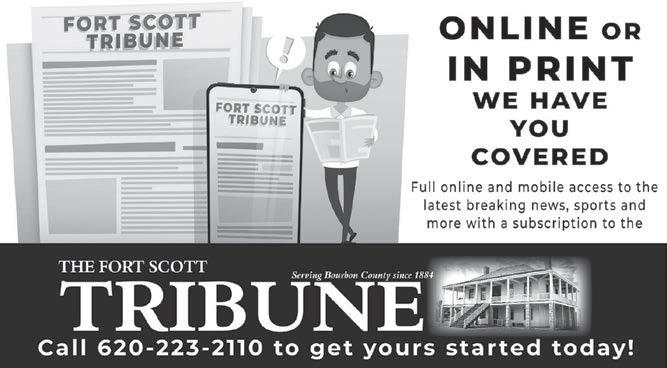 THE NEWS/COUNTRYSIDE, WEDNESDAY, FEBRUARY 8, 2023 3 3 month $26.00 • 4 Day a week printed publication • Unlimited access to online • E-Edition 1 YEAR $92.00 • 4 Day a week printed publication • Unlimited access to online • E-Edition 6 months $52.00 • 4 Day a week printed publication • Unlimited access to online • E-Edition Subscriptions Rates, options starting as low as $9.00 per month. Ask about E-Z Pay option pricing. Call 417-667-3344 to start your subscription today! 3 month $17.00 • 2 Day a week printed publication • Unlimited access to online • E-Edition 1 YEAR $61.00 • 2 Day a week printed publication • Unlimited access to online • E-Edition 6 months $34.00 • 2 Day a week printed publication • Unlimited access to online • E-Edition Subscriptions Rates, options starting as low as $6.00 per month. Ask about E-Z Pay option pricing. Call 620-223-2110 to start your subscription today! Do-it-yourself energy. Right in your backyard. If you choose to heat with wood, you know the value of having a readily-available heat source right in your back yard. With the E-Classic’s efficient design and operation, you can heat your entire home, shop and more with up to 70% less wood than other wood-burning appliances. R’NS Farm 941 2400th St. Iola, KS 66749 620-496-2406 *Instant rebate savings up to $750 on select in-stock Central Boiler outdoor furnace models. Savings shown is on an E-Classic model with gas ignition kit option. See dealer for details. centralboiler.com For t Scott, KS | 620-215-6864 | www.andersonauctionllc.com Farm Auctions | Estates | Business Liquidations | Real Estate MART Y READ AUCTION SERVICE INC. 913-795-2508 www.martyreadauction.com Jim Martin 620-235-2151 Larry Martin 620-224-4300 620-223-4600 www.fslivestock.com Licensed in Kansas & Missouri. (J.R.) Donald L. Stewart, Jr Owner/Broker Diann Tucker Owner/Broker RESIDENTIAL • FARMS COMMERCIAL • AUCTION 1707 S. National Sales 2nd and 4th Wednesday of the month Nevada, MO Owners: Nathan Collins 620-215-4745 Karrie Collins 620-644-2197 FEBRUARY 8TH Tack starts at 5 pm Livestock and Horses 8 pm Like us on Facebook @ Heartland Horse and Livestock Sales LLC for future consignments Today is the Last Day to get your Love Buds submitted for the special feature in the Fort Scott Tribune Feb. 11th edition Jamie Harreld Licensed Insurance Broker harreld@earthlink.net Specializing in: Medicare Advantage Plans Medicare Supplements Prescription Drug Plans 13749 East Mission Road Nevada, MO 64772 Licensed in Missouri & Kansas Phone 417-321-1204 Steve’s Lawn Mowing Service Steve Bosley Insured Mowing & Weedeating Cemeteries Businesses Residental For t Scott, Ks (785) 521-0294 COIN AUCTION Sat. Feb. 11, 2023 - 10:00 A.M. 3003 N. Joplin, Pittsburg, Ks. Homer Cole Community Center Auctioneers: Lance Anderson - 620-215-6864 Jon Prideaux - 620-231-7494 Selling several Coin Collections for Estates in South East Kansas. Lots of Silver & Gold, currency commemoratives, few Jewelr y pieces, collectible Pens and Guns. Check the web site for over 200 pictures at: prideauxauctionser vice.com Auctioneers Note: Possibility of more lots by sale time. Check web site closer to sale date. Terms: Cash or Check w/ID Comfortable accommodations No Credit Cards Not responsible for accidents The Nevada Daily Mail/Fort Scott Tribune OFFICES WILL BE CLOSED on Monday, February 20, 2023. The Nevada Daily Mail will not publish on February 21, 2023. Deadline for ad copies for the February 22nd edition of the Nevada News/Fort Scott Countryside 4PM, Thurs., Feb. 16, 2023. Deadline for ad copies for the February 22nd edition of the Nevada Daily Mail/Fort Scott Tribune 4PM, Fri., Feb. 17, 2023. FEBRUARY 2023 Call or Text Tom Hill 620-224-8752 CattleActive is an all-natural oral drench developed to neutralize excess acid in the rumen. It is suitable for use in beef and dairy cattle of all ages. Zesterra is an all natural supplement designed for horses during times of stress, such as hauling, heavy training, foaling or periods of extreme heat or cold
