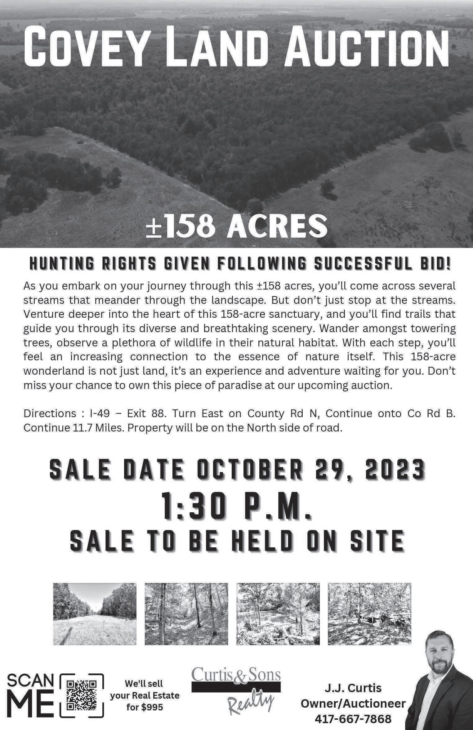 10 THE NEWS/COUNTRYSIDE, WEDNESDAY, OCTOBER 4, 2023 ESTATE AUCTION LINDA SCAMMELL Curtis & Sons Auction Service is proud to be working with the late Linda Scammell Estate in offering his Real Estate and Personal Property at a Public Auction. Linda Scammell OCTOBER 2110:00 A.M. at 9636 E. D Hwy Richards, Mo 64778 Open House - October 12th 4:00 P.M. to 6:00 P.M. Remarkable ±40-acre m/l estate in Vernon County, Missouri. This exquisite property boasts a harmonious blend of lush pastures and fertile farmland, complete with a pond and perimeter fencing. Tucked away on a peaceful blacktop road, you'll relish in the luxury of a lengthy private driveway. The residence spans a generous 2500 square feet and was constructed in 2000. Additionally, there is a 20x25 outbuilding and a detached 24x36 garage. Immerse yourself in the magnificence of this truly picturesque oasis. Personal property portion will start at 10am. Real Estate sells at noon. •Gravely Zero Turn Mower • Craftsman Power Tools • Furniture/Households • For a full sale bill see our website at www.curtisandsonsrealty.com J.J. Curtis 417.667.1220 We'll sell your Real Estate for $995 Directions : I-49 – Exit 110 for Co Rd D towards Stotesbury. Follow to 9636 E. D Hwy Richards, Mo. Real Estate sells at Noon Sharp! ESTATE AUCTION HERMAN JANK Curtis & Sons Auction Service is proud to be working with the late Herman Jank Estate in offering his Real Estate and Personal Property at a Public Auction. Herman Jank OCTOBER 2811:00 A.M. at 411 S. Adams • Nevada, MO 64772 Open House - October 11th 4:00 P.M. to 6:00 P.M. Step back in time with this Victorian gem, originally built in 1882. Every inch of this historic home showcases its timeless elegance and charm. As you step through the front door, you’ll be greeted by the enchanting sight of pocket doors that seamlessly lead you from room to room. The craftsmanship is truly unmatched, with handcrafted trim adorning the walls and tall doorways that create a feeling of grandeur throughout. Don’t miss the opportunity to own a piece of history. . Personal property portion will start at 11am. Real Estate sells at noon. •Tools • Firearms • Antique Furniture For a full sale bill see our website at www.curtisandsonsrealty.com J.J. Curtis 417.667.1220 We'll sell your Real Estate for $995 Real Estate sells at Noon Sharp! FALL 2023 FARM AND RANCH CONSIGNMENT AUCTION Friday, Oct. 13 @ 10:00am LOCATION: 3 miles east of fort Scott KS on Hwy 54 Printed by The Nevada News - 131 S. Cedar, Nevada, MO 64772 - 417-667-3344 Gene Johnson 620-223-2586 or Andy Johnson 620-224-6512 TRACTORS John Deere 4230 quad range, rough cab. IH 1086 with bushhog quick attach frontend loader hay spear and bucket. IH 786 open station tractor with farm hand 1140 quick attach loader and bucket has weak clutch. Ford 3000 fresh engine overhaul and restoration-nice tractor. 1949 B john Deere runs good. John Deere B. 2) john Deere model 50s. Massey Ferguson 150. Massey 202 with loader. Moline Jetstar tractor. TRUCKS AND TRAILERS 1969 Chevrolet c60 with bed and hoist runs good. 1993 Chevrolet ½ ton pickup 4x4 good truck. Lone wolf 40’ gooseneck flatbed trailer w/dove tail ramps, tandem dual oil bath axles very nice trailer. 24’ gooseneck flatbed trailer dove tail and ramps. SKID STEER AND EQUIPMENT Case 1840C skid loader, 1100 hours very well maintained nice low hour machine. New 10 bale accumulator and bale grapple never used. Pallet fork. Bale spike. EQUIPMENT 10’ 3pt rotary mower. Kuhn GDM 77 9’ disc mower. 12-wheel h&s bifold rake good condition. New holland 660 round baler.