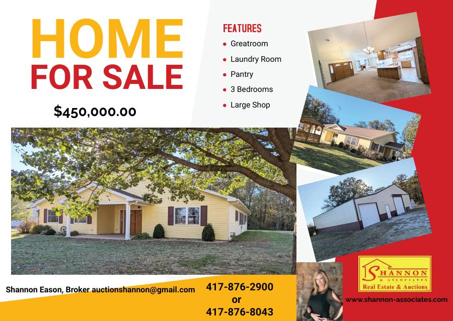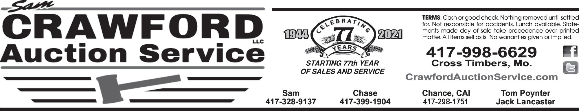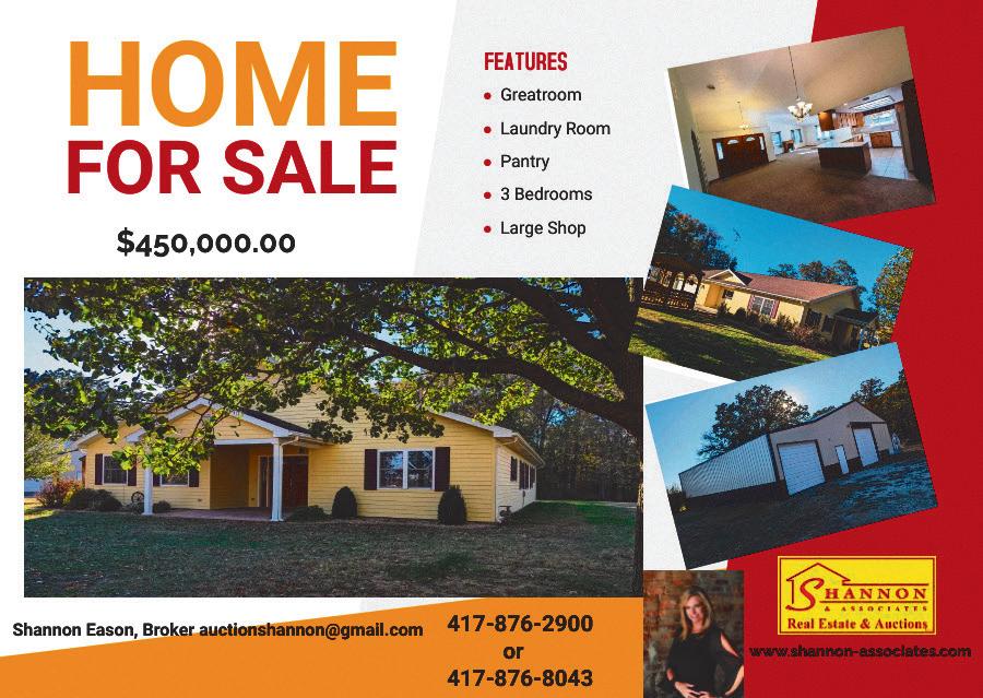 Sam 417-328-9137 Chase 417-399-1904 Chance, CAI 417-298-1751 CrawfordAuctionService.com 417-998-6629 Cross Timbers, MO YEARS 1944 2024 Selling all types of Auctions SPECIALIZING IN RURAL REAL ESTATE SALES & AUCTIONS Farms & Farmland • Investment Properties Recreational Land • Hunt Properties & MORE! Auctioneers: Mark Kennedy, Wayne Keller and Don Bailey buyafar m.com 800-443-1998 Appleton City, MO 64724 www.jackfennewaldauctionservice.com TOWN & COUNTRY Real Estate & Auction Ser vice Farms • Estate • Antiques www.tncnevada.com DOUG WORTMAN - 417-448-9540 doug@tncnevada.com Broker/Auctioneer Licensed in Missouri & Kansas Re a l Es t a t e & Au c ti o n s , LLC • 35yrs. Experience • ProvenTrack Record • Customized Marketing Plan • 100% Customer Satisfaction • Immediate Settlement Real Estate Specialists Farms • Residential • Equipment • Estates 417-876-2900 office • (417) 876-8043 cell www.shannon-associates.com Sold $14,250.00/Acre at auction, you could be next next 10 THE NEWS/COUNTRYSIDE, WEDNESDAY, APRIL 24, 2024