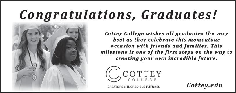 10 THE NEWS/COUNTRYSIDE, WEDNESDAY, MAY 17, 2023 225 W. Walnut Street • Nevada, MO www.thehtrealtygroup.com Congratulations to Colby Bourassa and Berkley Wood! Colby Berkley 2023 And all area 2023 Graduates Nevada HS Ft Scott HS Trinity we are so proud of you and your accomplishments! We know you hold a bright future, and your best is yet to come! CONGRATULATIONS! ARCHER DANIELS MIDL AND would like to congratulate ARCHER DANIELS MIDLAND would like to congratulate all area graduates including We are so proud of our employees and their graduating seniors. CONGRATULATIONS! a special congratulations to the students in the ADM family at Deerfield, MO. Graduation is a time to commemorate your achievements, anticipate for future opportunities, and embrace a world of infinite possibilities. Dream Big, work hard, Stay Focused, and surround Yourself with Good people. 101 N Main • Nevada, MO 417-667-7874 • agency@renwickins.com to all area Class of 2023 GRADUATES ox 35 • Walker, MO 64790 417-465-2260 NEW and RE-MANUFACTURED Laser Car tridges, Ribbons, Copier Toner, Printer Repair and other office supplies! And ALL LOCAL AREA GRADUATES KYLAN BACHAND, Senior at NEVC R-1 3270 S. Hwy 32 • El Dorado Springs www.eldoradocycle.com (877) 390-5148 111 N Main, Nevada, MO 417-667-3076 Mon-Fri 8:30am-5pm Wed until 8pm Sat 8am-12pm Delton L. Fast, OD Jeremy M. Fast, OD Eyecare Professionals, Inc. Congratulations to all area 2023 Graduates! 2101 E. Austin, Nevada 417-667-3100 MON-SAT: 7:30A - 8PM • SUNDAY: 9AM - 5PM We are proud of all the area graduates! cottey.edu Congratulations, Graduates! Cottey College wishes all graduates the very best as they celebrate this momentous occasion with friends and families. This milestone is one of the first steps on the way to creating your own incredible future. Cl s 2023 OF (417) 876-4741 123 US Hwy 54 • El Dorado Springs, MO Congratulations to ALL our Seniors! BRANCH Main Street • Metz, MO 417-484-3500 MAIN OFFICE 123 N Osage • Nevada, MO 417-667-4550 WWW.METZBANK.BANK Congratulations to all area graduates. You make us proud! to the