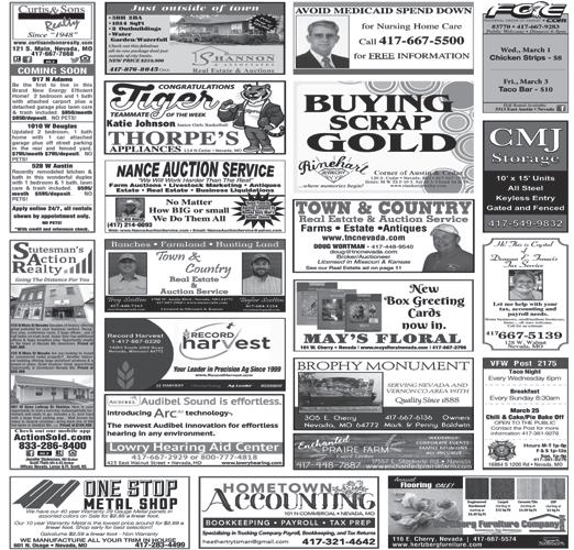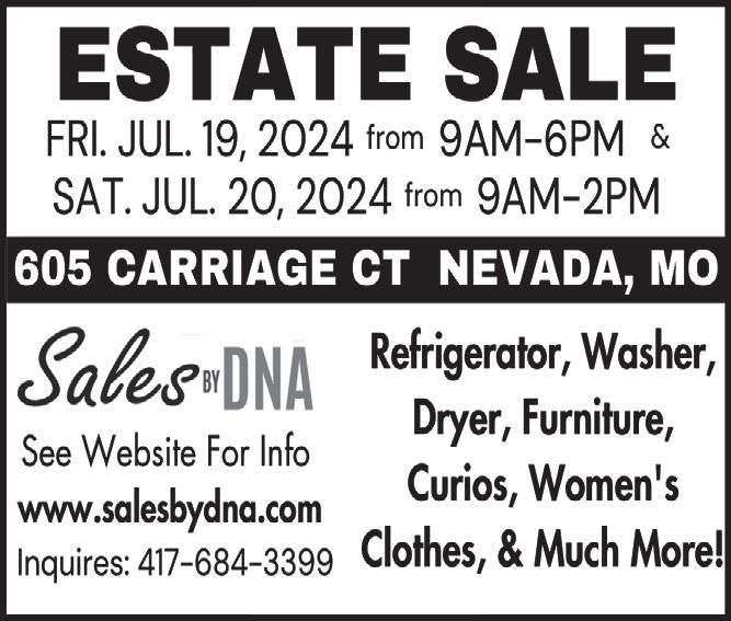 STORAGE UNIT CONTENTS released for sale at storage unit auction for the Westside and Downtown Storage locations. Auction will begin at the Westside Storage Office location at 101 S. Prewitt in Nevada, MO. July 10, 2024 at 6 p.m. Cash Only. G & L Bookkeeping is taking appointments for the preparation of you tax returns. Reasonable rates and electronic filing. Call Gail at 667-2151 for an appointment. Curb service for the handicapped.