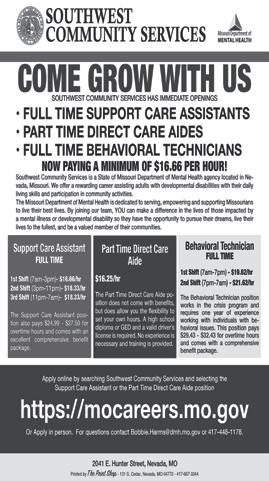 DEADLINES for the Nevada News/Fort Scott Countryside is 4pm the Friday prior to the publication date unless otherwise published. Late ads are accepted as space allows ONLY. For information please call 417-6673344 or 620-223-2110.