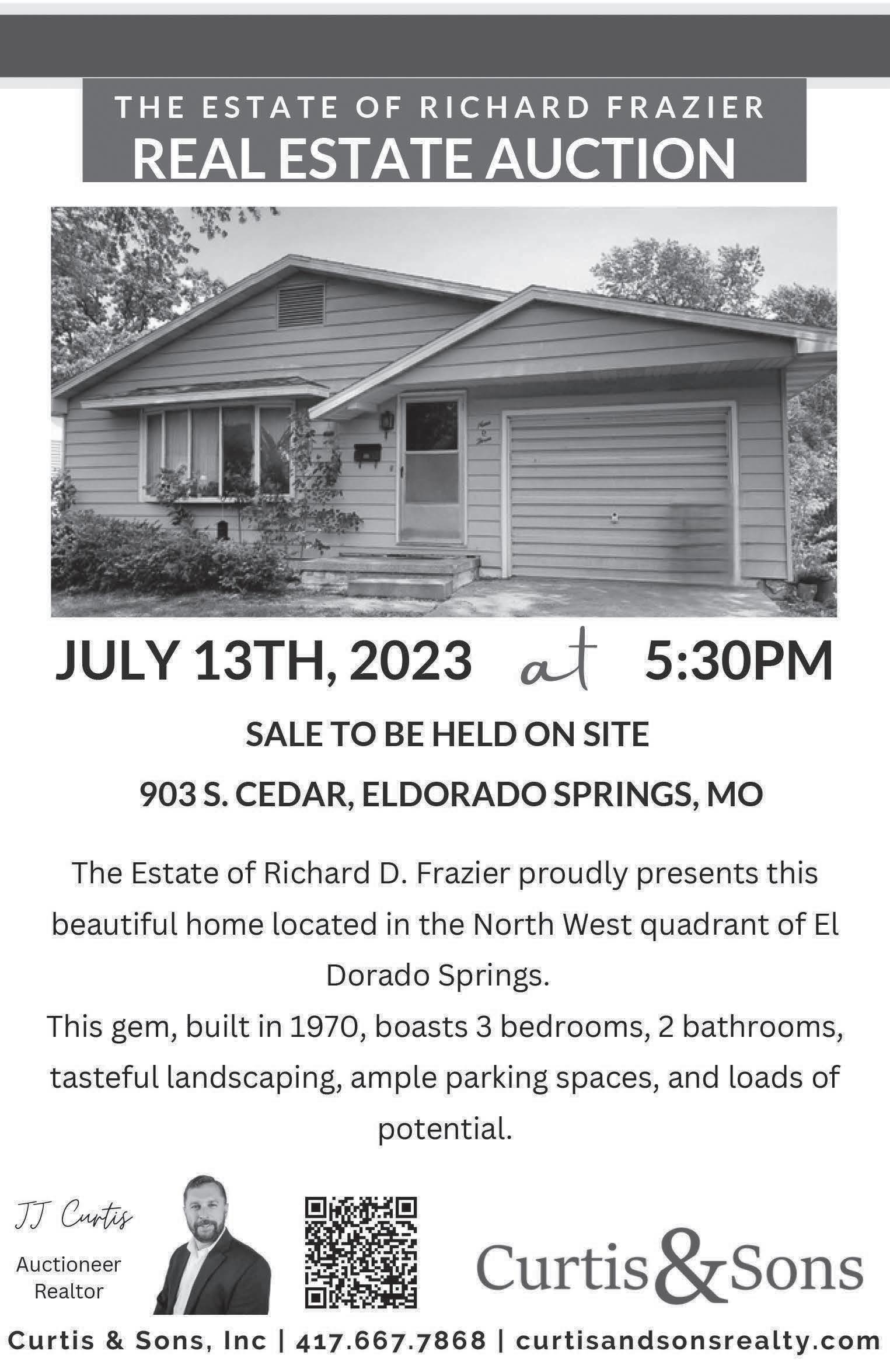 $199,000 CURTIS & SONS AUCTION CALENDAR Auction Thursday, July 13th @ 5:30 pm 903 S Cedar El Dorado Springs, MO AUCTION: Thursday, July 20th @5:30pm Metz, MO Pavillion Auction Saturday, August 19th @ 10am Hume, MO Auction Saturday August 26th Milo