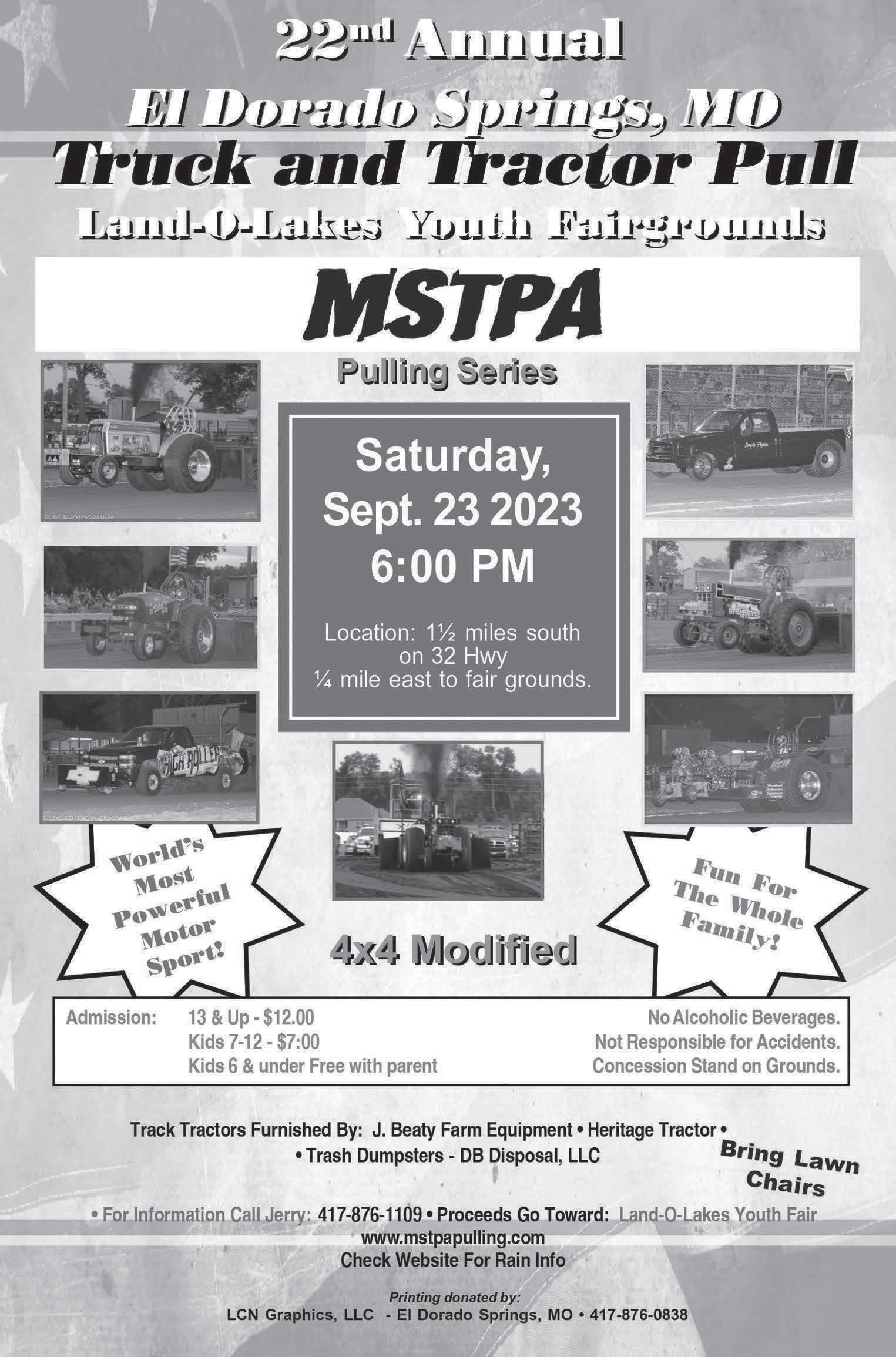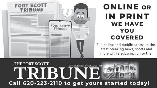 THE NEWS/COUNTRYSIDE, WEDNESDAY, SEPTEMBER 20, 2023 3 PRINT SHOP NEVADA DAILY MAIL/NEVADA NEWS WWW.NEVADADAILYMAIL.COM From Business Cards, Envelopes, Invoices to Invitations and much more. Visit our website today Do-it-yourself energy. Right in your backyard. If you choose to heat with wood, you know the value of having a readily-available heat source right in your back yard. With the E-Classic’s efficient design and operation, you can heat your entire home, shop and more with up to 70% less wood than other wood-burning appliances. R’NS Farm 941 2400th St. Iola, KS 66749 620-496-2406 *Instant rebate savings up to $750 on select in-stock Central Boiler outdoor furnace models. Savings shown is on an E-Classic model with gas ignition kit option. See dealer for details. centralboiler.com For t Scott, KS | 620-215-6864 | www.andersonauctionllc.com Farm Auctions | Estates | Business Liquidations | Real Estate Jim Martin 620-235-2151 Larry Martin 620-224-4300 620-223-4600 www.fslivestock.com Licensed in Kansas & Missouri. (J.R.) Donald L. Stewart, Jr Owner/Broker Diann Tucker Owner/Broker RESIDENTIAL • FARMS COMMERCIAL • AUCTION 1707 S. National Jamie Harreld Licensed Insurance Broker harreld@earthlink.net 13749 East Mission Road Nevada, MO 64772 Phone 417-321-1204 O ering - Medicare SupplementsMedicare Advantage Plans - Prescription Drug Plans - Hospital Indemnity Plans Licensed in Missouri and Kansas Sales 2nd and 4th Wednesday of the month Nevada, MO Owners: Nathan Collins 620-215-4745 Karrie Collins 620-644-2197 September 27th Tack starts at 5 pm Livestock and Horses 8 pm Like us on Facebook @ Heartland Horse and Livestock Sales LLC for future consignments PRICE INCLUDES: • 40X60X12 BARN INSTALLED ON YOUR LEVEL SITE • 1-10X10 NON-INSULATED GARAGE DOOR • (1) 3’ NINE-LITE ENTRY DOOR • (3) 3X3 SINGLE-HUNG WINDOWS • SOLEX ON ROOF • 12” OVERHANGS • 4’ WAINSCOATING • 4” CONCRETE WITH REBAR Installing quality buildings since 2005! 1-800-823-8609 Location: Gar nett, KS Travel charges may apply Price effective thru Sep. 30th 1-800-823-8609 40’X60’X12’ BARN FOR ONLY $59,900!! www.yutzyconstruction.com HOLMTOWN PUB Now Hiring KITCHEN MANAGER AND PART-TIME COOK Apply in person. Must be 18 or older 206 N. National Ave. • For t Scott Ks. Your Business is OUR Business 131 S. Cedar • Nevada, MO 417-667-3344 • www.nevadadailymail.com 6 N. Main • Fort Scott, KS 620-223-2110 • www.fstribune.com CUSTOM CARDS FOR EVERY OCCASION • Birthday • Wedding • Thank You • Get Well • Holiday • Bridal Shower • Baby Shower • Farewell • Sympthay • Graduation And So Much More