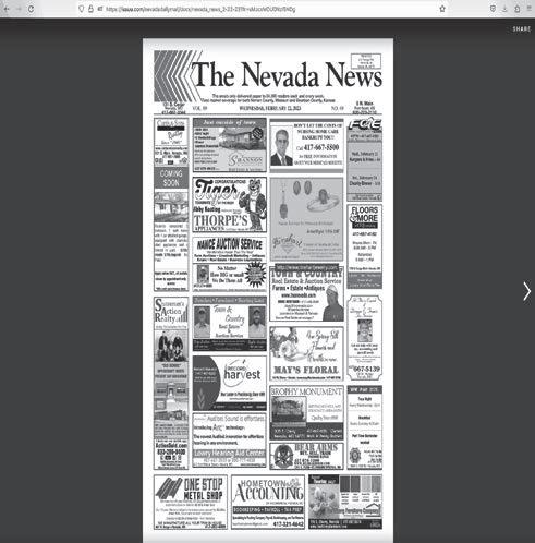 PRSRT STD U.S. Postage Paid Permit No. 40 Nevada, Mo. 64772 131 S. Cedar Nevada, MO 417-667-3344 6 N. Main Fort Scott, KS 620-223-2110 VOL. 90 WEDNESDAY, SEPTEMBER 6, 2023 NO. 25 The area’s only delivered paper to 34,000 readers each and every week. Total market coverage for both Vernon County, Missouri and Bourbon County, Kansas Your Leader in Precision Ag Since 1999 Hi! This is Crystal of Deanna E. Francis Tax Service 128 W. Walnut Nevada, MO 417667-5139 Let me help with your tax, accounting and payroll needs. Home businesses, small/medium businesses, farms.....all sizes welcome. Call for an estimate AVOID MEDICAID SPEND DOWN for Nursing Home Care Call 417-667-5500 Kendall Vickers Noah Fischer TOWN & COUNTRY Real Estate & Auction Service DOUG WORTMAN - 417-448-9540 doug@tncnevada.com Broker/Auctioneer Licensed in Missouri & Kansas Farms • Estate •Antiques www.tncnevada.com See our Real Estate ad on page 11 BROPHY MONUMENT SERVING NEVADA AND VERNON CO AREA WITH Quality Since 1888 305 E Cherry 417-667-6136 Owners Town & CountryReal Estate & Auction Service Ranches • Farmland • Hunting Land Troy Scotten 417-448-7163 troy@tncnevada.com Taylor Scotten 417-684-1224 ctscotten@gmail.com 1700 W Austin Blvd., Nevada, MO 64772 417-667-2966 • www.tncnevada.com Licensed in Missouri & Kansas Sunday, April 10th, 2016~1:00 PM LOCATION: 26280 South 1425 Road, Sheldon, MO; Directions: From Sheldon Go West On N Hwy To 1425 Road Then North To Sale Site Or From Nevada Go South On BB Hwy To 1425 Road Then Continue South To Sale Site (Watch For Signs) Auction For Barb & The Late Ivan Diggins Auctioneers Note: As Ms. Diggins Has Sold Her Farm We Will Offer A Very Clean & Outstanding Farm & Estate Auction. Equipment & Tools Are Very Clean & Ready. There Are Some Very Neat Households, Beer Items & Antiques. This Is A Very Nice Auction. Something Here For Everyone. Please Plan Now To Attend. Sale Order: Furniture, Households & Antiques, Will Sell First Followed By Small Tools & Outdoor Items. At Approx 3:00 PM Will Offer Tractors, Auto, & Large Items. Remainder Of Small Tools & Outdoor Will Finish Auction. See Ya There!!! Terms: Cash or check with proper ID. Now accepting most major credit cards. Nothing removed until settled for. Statements mad e the day of sale takes precedence over printed material. Everything sold as is where is. Not responsible for accidents. Restroom available. Conces sions Provided By Pig Out Grill. Check our website for upcoming auctions and for additional pictures!! Magnum 325 4 Wheeler, JD 190 Walking Plow, Fuel Barrel On Stand, Tractor Wheel Chains, 16 Ft Gate, Calf Hut, Steel Posts, 2 Rolls Barbed Wire, Fence Stretchers, Buckets, Sm Field Sprayer, RxR Ties, Used Tires, Other Items Not Listed Car, Tillers, Yard Cart, Tools & Outdoor 1994 Grand Prix LE 4 Door Car That Has 4 Cy Motor, Auto Trans, Approx 100,000 Miles, JD 15 Yard Utility Dump Cart, Snapper RT8 Rear Tine Tiller, Mantis Tiller, Push Mower, Chipper/ Shredder On Wheels W/Tongue, Weed Eater, Leaf Blower, Yard Seeder, Garden Seeder, Chainsaw Parts, Stihl 028 Chainsaw, Craftsman Chainsaw, Shindawa Chainsaw, Wheelbarrow, Sm 115 Arc Welder, Sm Torch Set W/Bottles, Dewalt Upright Compressor, Table Saw, Scroll Saw, Chop Saw, Drill Press, Sm Electrical Tools, Kerosene BTU Heater, Battery Charger, Air Tools, Sm Hand Tools, Toolboxes, Long Handle Tools, Alum Long, Truck Toolbox, Sm Shop Vac, Dolly, Hose Reel, Trash Cans, Dog House, Fishing Poles, Some Ammo, Scopes, BB Gun, No Matter How BIG or small, We Do Them All!!! www.nanceauctionservice.com Col. Joe Haines 417-276-7914 Col. Bill Nance 417-214-0093 Furniture, Antiques & Households Matching Couch & Loveseat, Recliner, Coffee Table, Computer Desk, Queen Size Bed, Console Stereo, Dressmaker Sewing Machine In Cabinet, Upright Deep Freeze, Microwave, TV, Humidifier, Dehumidifier, Vacuum Sweeper, Several Beer Advertising Lights & Signs, Collection Of The Wild Turkey Figurine Series, 8 Track Tapes, Old Porcelain Bedpan, Old Feed Sack Quilt Top, Old Tins, Old Lantern, 3 Old Push Plows, Old Tractor Seat, Milk Can, Mule Muzzle, Coal Buckets, Old Scales, Nail Keg, Treadle Sewing Machine Base, Old Hub Cabs, Old Clothesline Posts, Wishing Well, Sm Windmill, Old Porch Swing, Porch Glider, Old Books, Knick Knacks, Milk Crates, Pots, Pans & Dishes (Some Old), Other Items Not Listed Tractors, 4 Wheeler, & Farm Related IH 504 Gas Tractor W/Wide Front End & Hydraulics, Westendorf WL2 Loader, (Will Sell Tractor & Loader Separate Then Put Back Together), Farmall Cub Tractor, Woods Belly Mower, 3 Pt 6 Ft Big Bee Bush Hog, Polaris 4x4 Col. Justin McIntyre 417-684 2777 Web: www.NanceAuctionService.com • Email: NanceAuctionService@yahoo.com “We Will Work Harder Than The Rest” Farm Auctions • Livestock Marketing • Antiques Estate • Real Estate • Business Liquidations No Matter How BIG or small We Do Them All Sunday, April 10th, 2016~1:00 PM LOCATION: 26280 South 1425 Road, Sheldon, MO; Directions: From Sheldon Go West On N Hwy To 1425 Road Then North To Sale Site Or From Nevada Go South On BB Hwy To 1425 Road Then Continue South To Sale Site (Watch For Signs) Auction For Barb & The Late Ivan Diggins Auctioneers Note: As Ms. Diggins Has Sold Her Farm We Will Offer A Very Clean & Outstanding Farm & Estate Auction. Equipment & Tools Are Very Clean & Ready. There Are Some Very Neat Households, Beer Items & Antiques. This Is A Very Nice Auction. Something Here For Everyone. Please Plan Now To Attend. Sale Order: Furniture, Households & Antiques, Will Sell First Followed By Small Tools & Outdoor Items. At Approx 3:00 PM Will Offer Tractors, Auto, & Large Items. Remainder Of Small Tools & Outdoor Will Finish Auction. See Ya There!!! Terms: Cash or check with proper ID. Now accepting most major credit cards. Nothing removed until settled for. Statements mad e he day of sale takes precedence over printed material. Everything sold as is where is. Not responsible for accidents. Restroom avai