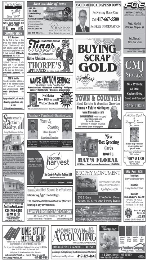 for details and availability 1 & 2 Bedroom Apartments Sheldon,MO STARTING AT $460/MO All Utilities included (electric, water, sewer, trash) plus DISH TV package and fully furnished or unfurnished. Laundry facility & community room provided. Check out our mobile app ActionSold.com Offices: Nevada, Lamar & Ft. Scott, KS 833-286-8400 Jennifer Stutesman Frese, MO Broker 417-667-1097 Scott Theis- MO, KS 417-321-0929 Diane Earll- MO 417-448-4023 Lori A. Bures- MO 417-684-7614 Jason Clapill- MO 417-684-5099 Veronica Szafranski 417-448-0043 Tressa Gawel 417-259-3761 Ginger Nance 620-224-6173 Connie Earll 816-721-0697 UNDER CONTRACT 15218 E BB Hwy Nevada This 4 bdr/2.5 bath home has so much to offer. �� Spacious living room & kitchen, decks on the front & back, and an oversized garage, carport, & built-in storm shelter. Country living with blacktop frontage. Home and 1 acre priced at $159,900. Property can be purchased with 38 acres, pond, corral, barn & home for $400,400 14734 E Redcoat Rd Nevada Welcome to Oakwood Subdivision�� Gorgeous cedar sided home nestled amongst the tall trees and a valley view from the back, that you are sure to love❤. This 5 bdr/3.5 bath offers natural light from the south, cathedral ceiling, fireplace, 3 �� garage, hot tub, a deck view like no other, and an HOA swimming pool for summer enjoyment. Priced at $369,750 602 E Floral St Nevada Ranch style 4 bdr/ 4 bath with a 21x26 business/office/showroom that could have many uses or work-at-home options. In the back you can enjoy privacy around the large fire pit, relaxing on the stamped concrete porch area, or outdoor activities in the beautifully manicured yard. Priced at 285,000 509 S Picher Ave Joplin This 2 bdr/1 bath home offers spacious bedrooms, a large back room that could provide separation for privacy, an excellent exterior, large fenced yard, storage shed, and a storm shelter�� Priced at 119,500 Contact Us for all your real estate needs Serving KS & MO Amanda 417-684-5681 Stacy 620-224-7773 Colten 417-321-3325 Dan 417-381-2609 225 W. Walnut Street • Nevada, MO www.thehtrealtygroup.com 417-321-7721 $125,000 NEW LISTING - 1200 E LOCUST ST - NEVADA Take a step back in time with this historical, solid brick building, built in 1923, offering a wealth of opportunities and potential! With 8600 sq ft of space, this unique property is bursting with character and endless possibilities for customization. Formerly a boxing gym and a school with a spacious interior this is ready for you to make it what your heart desires. – Call Amanda $65,000 NEW LISTING - 20479 E K HIGHWAY - NEVADA Welcome to a perfect blend of country tranquility & modern luxury in this expansive 3 bed 2 bath ranch home. Over 1500 sf of living space w/ large Master bedroom connected to master en suite that includes elegant tile, double vanity, walk-in closet, stand-up shower equipped w/ dual shower heads & body sprays. The kitchen is a culinary haven, featuring stainless steel appliances, marble countertops, & a tiled backsplash. Additional highlights include a finished and attached two-car garage, offering ample storage space and built-in cabinetry. The outside features a large, beautiful wood deck and a fenced yard. – Call Dan $190,000 Need to Get Rid of the Clutter? Advertise In 417-667-3344 620-223-2110 Real Estate Needs? Adver tise! 417-667-3344 620-223-2110 Advertise Your Service Here! 417-667-3344 620-223-2110 Advertise Your Help Wanted Here! 417-667-3344 620-223-2110 DEADLINES: for the Nevada News/Fort Scott Countyside is the Friday at 4PM prior to the publication date. you are only paying $.45 per issue! That's a savings of over $90 a year over the rack price! Did you know? By purchasing a yearly subscription Get Started to the Nevada Daily Mail Call 417-667-3344 or stop by to get started today! you are ONLY paying $.58 per issue! That's a savings of over $44 a year over the rack price! Get Started to the Fort Scott Tribune Call 620-223-2110 or stop by to get started today! Keep Reading for Great Deals!! Keep Reading for Great Deals!! Keep Reading for Great Deals!! Keep Reading for Great Deals!!