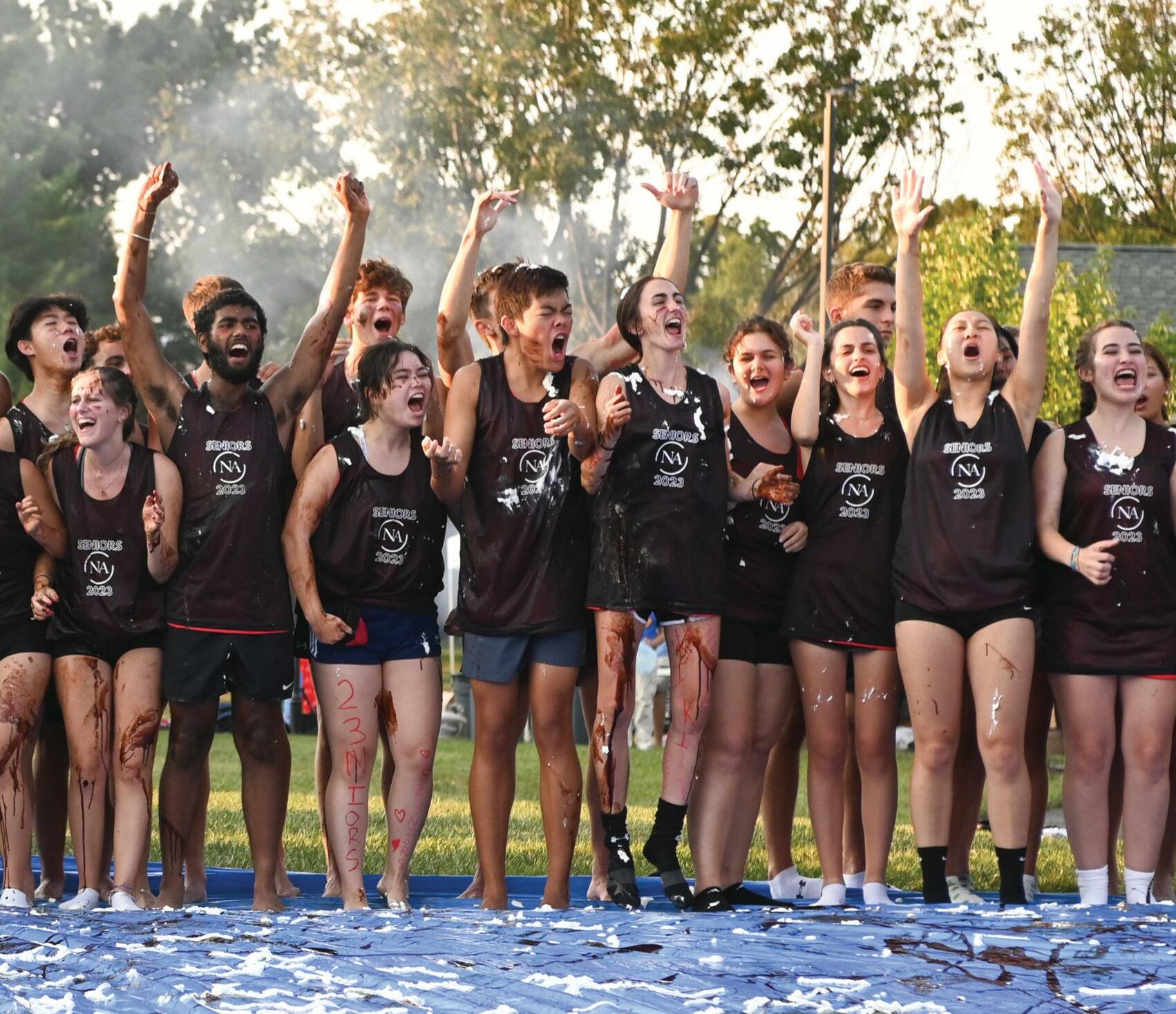 The Class of 2023 cheers as they get ready to go down the traditional senior chocolate slide at the Back to School BBQ.