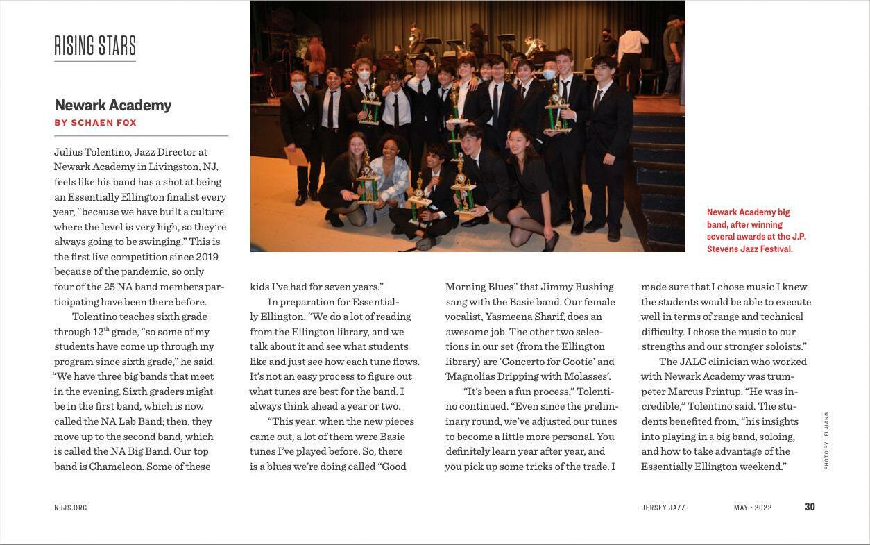 This issue of LUMEN highlights recent accomplishments of the Newark Academy community with a particular focus on our excellence beyond the classroom Our students excelled in athletics and arts this past year, earning recognition at both the state and national levels. Minutemen Athletic teams won a total of eight state championships the highest recorded number in our school’s history. Our jazz band, Chameleon, qualified and played in the prestigious Essentially Ellington festival at Lincoln Center for the sixth time, and they won the New Jersey Association for Jazz Education title for the 11th straight year Hundreds of other Newark Academy artists and athletes left their mark on the stage and our courts and fields