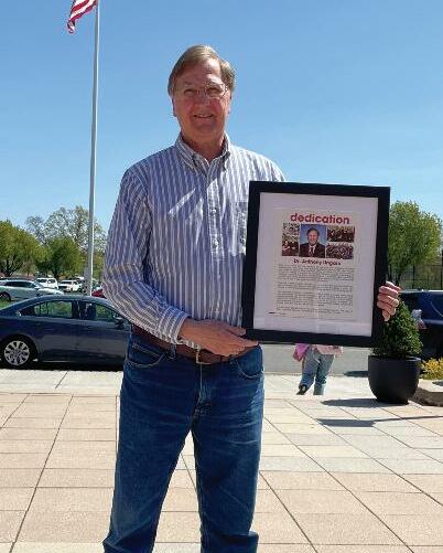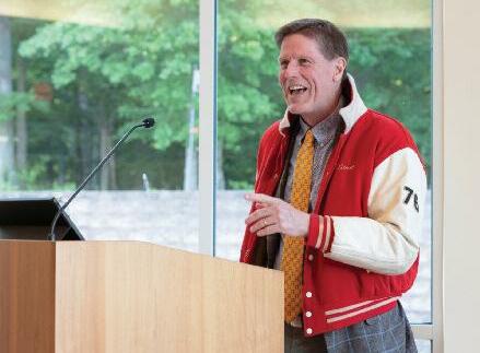 S. Dillard Kirby ’77 wears his old NA varsity football jacket during his Fulton H MacArthur Award acceptance speech.