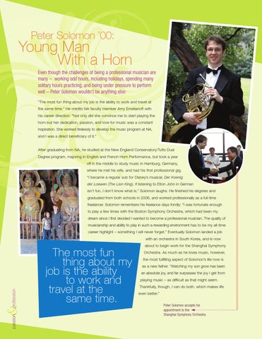 Young Man With a Horn Even though the challenges of being a professional musician are many – working odd hours, including holidays, spending many solitary hours practicing, and being under pressure to perform well – Peter Solomon wouldn’t be anything else: “The most fun thing about my job is the ability to work and travel at the same time.” He credits NA faculty member Amy Emelianoff with his career direction: “Not only did she convince me to start playing the horn but her dedication, passion, and love for music was a constant inspiration. She worked tirelessly to develop the music program at NA, and I was a direct beneficiary of it.”