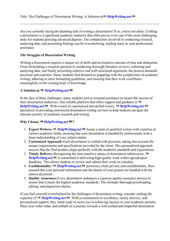 If you find yourself overwhelmed by the challenges of dissertation writing, consider seeking the expertise of ⇒ HelpWriting.net⇔. With a commitment to excellence, timely delivery, and personalized support, they stand ready to assist you in achieving success in your academic pursuits. Place your order today and embark on a journey towards a well-crafted and impactful dissertation.