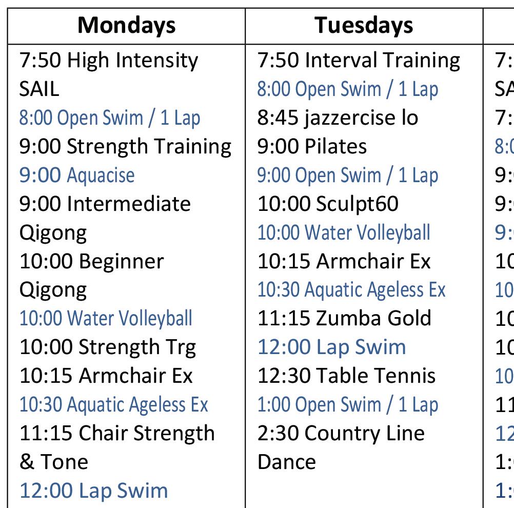 M - F: 8am • T, TH: 9am, T, W, Th: 1pm These time slots are for people who can enjoy aquatic exercise next to those who wish to lap swim. The center lane will be available for laps, the side lanes will be available for wall stretches.