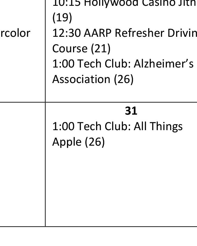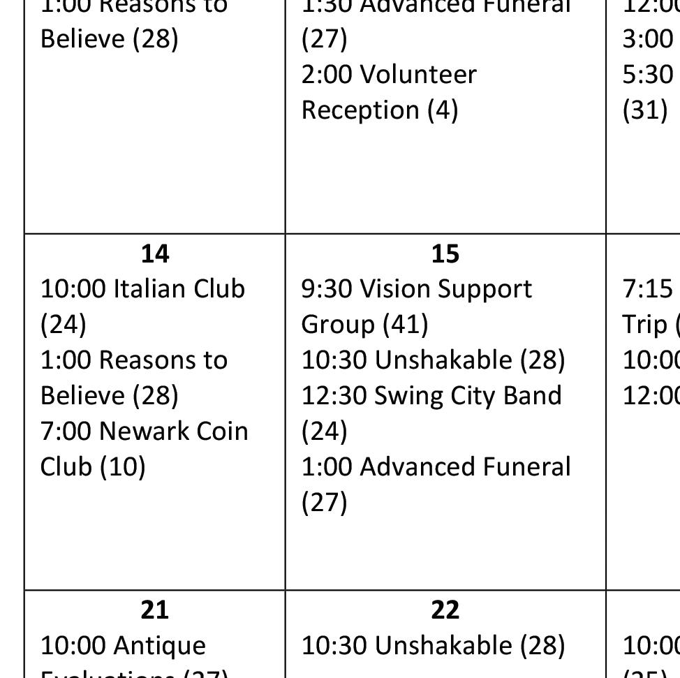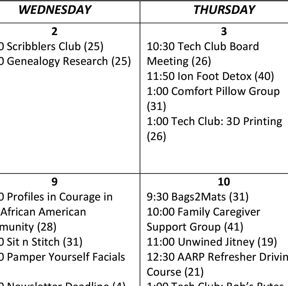 Would you like to see more evening and weekend social events at the Center? We need your help! If you are unable to attend a meeting and would like more information, please contact Maura at 302-737-2336 ext 101 or maura@newarkseniorcenter.com.