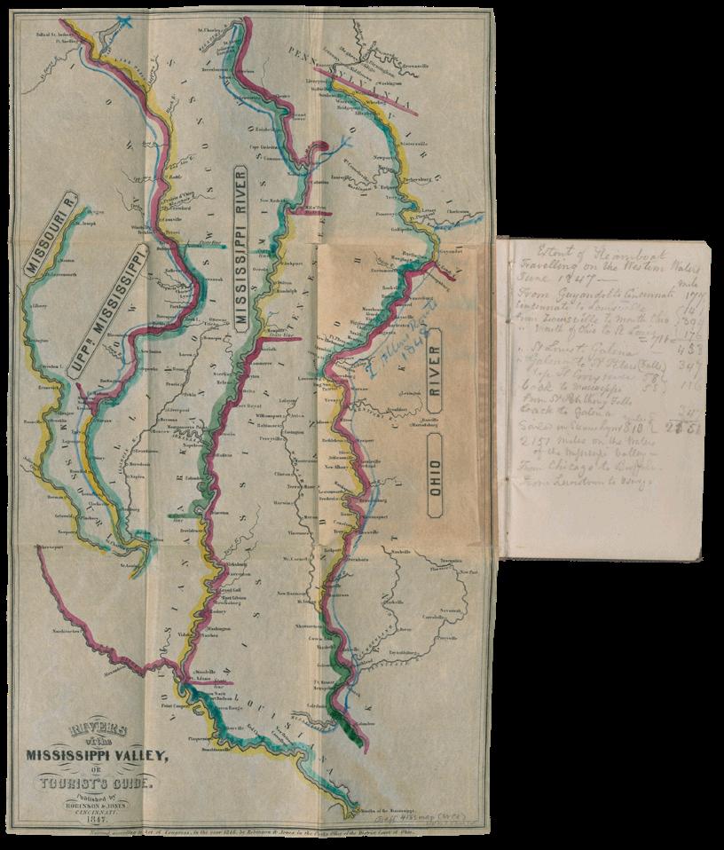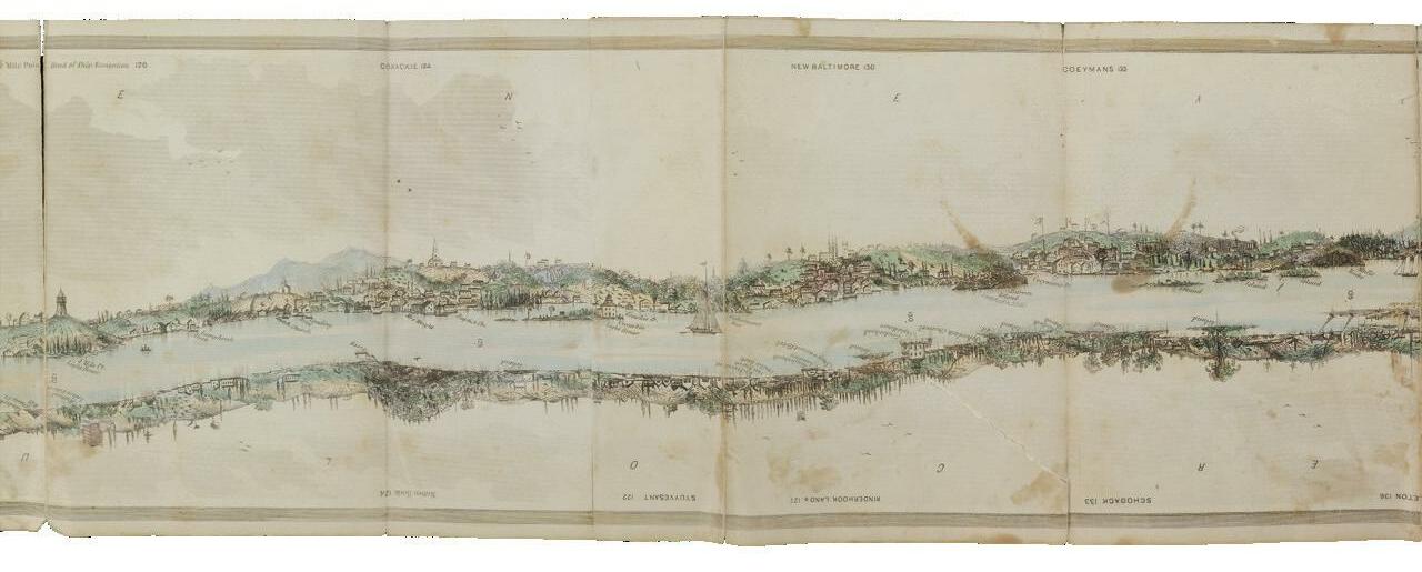 The 150-mile course of the Hudson River , from New York Harbor to north of Albany, served as an important route for travel, trade, and migration throughout the nineteenth century. More than 12 feet in length, this accordion-style map of the Hudson was published in 1846 by John Disturnell, one of the leading publishers of maps and guidebooks at the time.