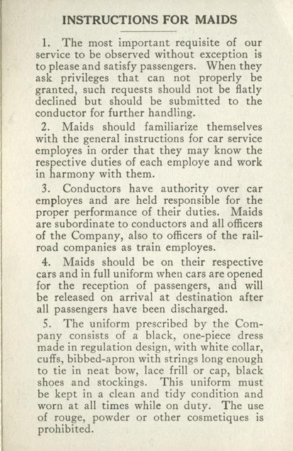 Above: Pullman maids figured prominently in advertisements touting the “comforts” found in Pullman cars. Left: Instructions for Pullman maids, 1925.