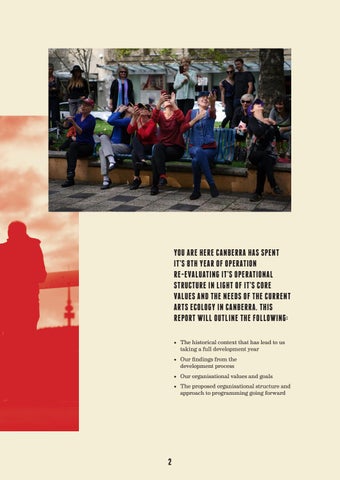 YOU ARE HERE CANBERRA HAS SPENT IT’S 8TH YEAR OF OPERATION RE-EVALUATING IT’S OPERATIONAL STRUCTURE IN LIGHT OF IT’S CORE VALUES AND THE NEEDS OF THE CURRENT ARTS ECOLOGY IN CANBERRA. THIS REPORT WILL OUTLINE THE FOLLOWING: • The historical context that has lead to us taking a full development year • Our findings from the development process • Our organisational values and goals • The proposed organisational structure and approach to programming going forward