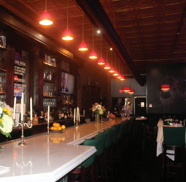 – maybe 20 for some of them – and I finally figured out what I was going to do with them,” Joe said. Adding to the casual, yet elegant, décor are the red pendant lights that hang from the tin ceiling above. Guests can hop on one of the upholstered bar stools in the bar area, which features a blend of rich wood accents and a sleek bar top, or on a dining chair outside or at one of the indoor tables, which are laden with white tablecloths and candles. Once seated, guests can open a menu that features an array of American Classic favorites and drinks and wine.