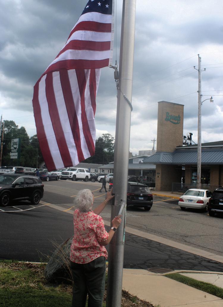 Library director Julie Grynwich raises the flag in Jon Putzke’s honor