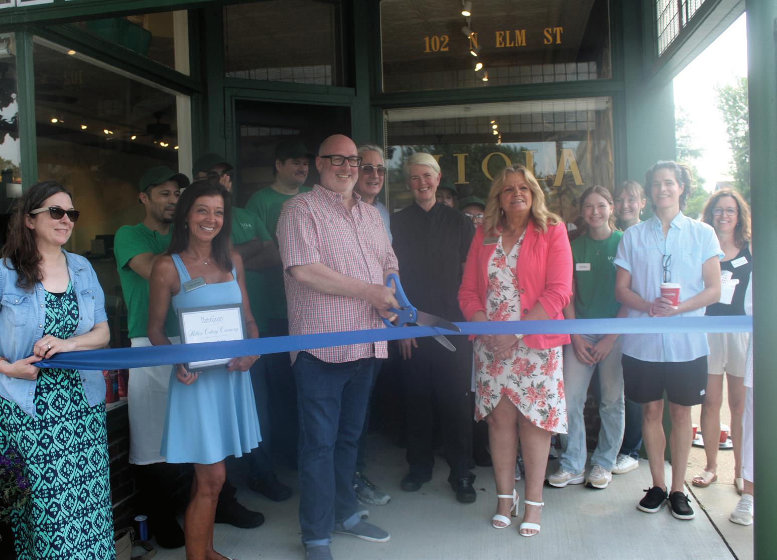 Members of the Harbor Country Chamber of Commerce cut the ribbon on Viola Cafe with owners Scott King and Anthony Bellon