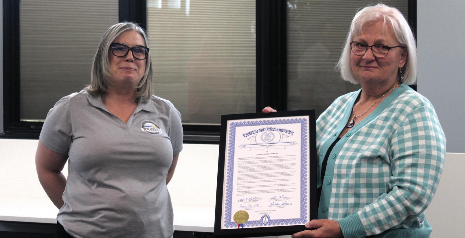 Dan Petersen, executive director of The Pokagon Fund, presented Zabicki with a picture of a snowy winter scene as a “perpetual reminder” of what she’s leaving behind.
