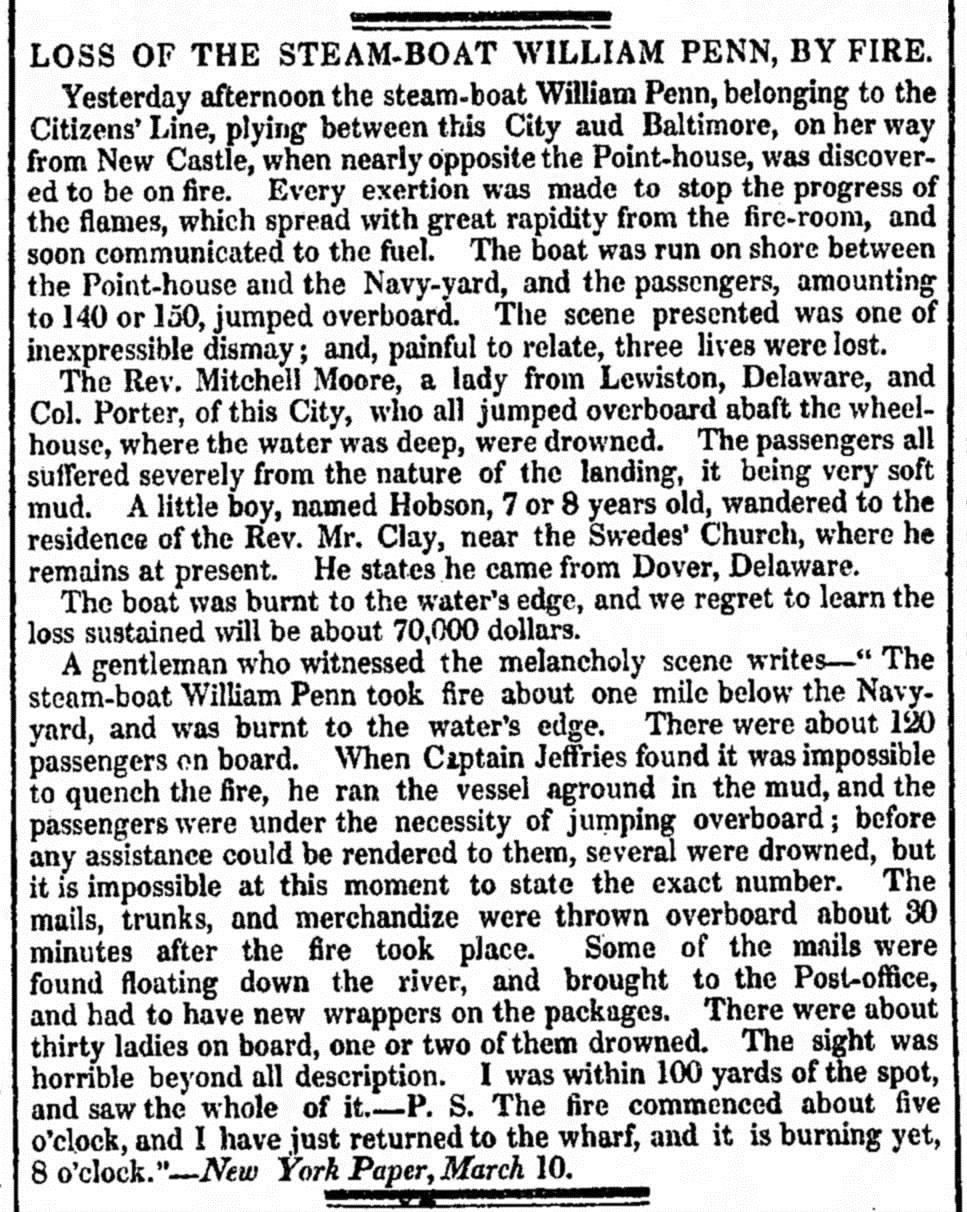 In 1834, the steamboat William Penn was travelling from New Castle to Philadelphia when it caught fire about 5 o’clock in the afternoon. The flames started in the fireroom and spread rapidly toward the ship’s supply of fuel. The ship had to be run aground about one mile south of the Navy Yard so that its approximately 150 passengers could jump overboard Several people drowned trying to escape including a woman from Lewes, Delaware